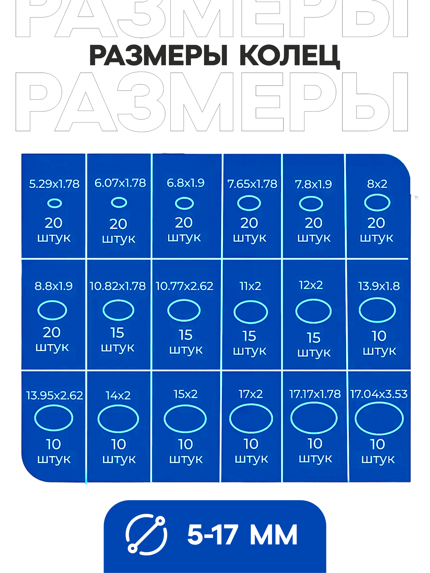 | Комплектация | 5,29х1,78 20 шт, 6,07х1,78 20 шт, 6,8х1,9 20 шт, 7,65х1,78 20 шт, 7,8х1,9 20 шт, 8х2 20 шт, 8,8х1,9 20 шт, 10,82х1,78 15 шт, 10,77х2,62 15 шт, 11х2 15 шт, 12х2 15 шт, 13,9х1,8 10 шт, 13,95х2,62 10 шт, 14х2 10 шт, 15х2 10 шт, 17х2 10 шт, 17,17х1,78 10 шт, 17,04х3,53 10 шт. |