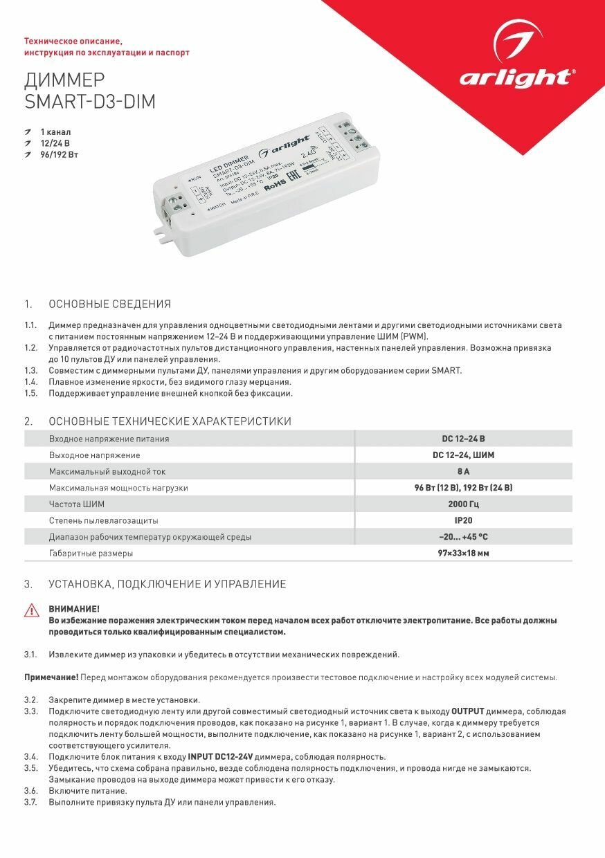 Arlight Диммер SMART-D3-DIM (12-24V, 8A) интересное: