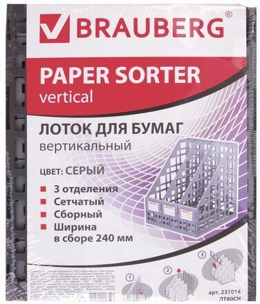 Купить Лоток для бумаг Brauberg вертикальный для бумаг "MAXI Plus", 240 мм, 3 отделения, сетчатый, сборный, серый