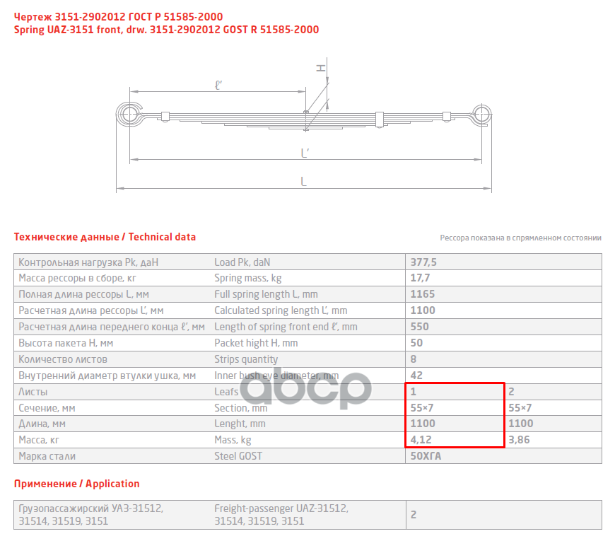 | Подробная комплектация | Лист передней рессоры - 1шт |