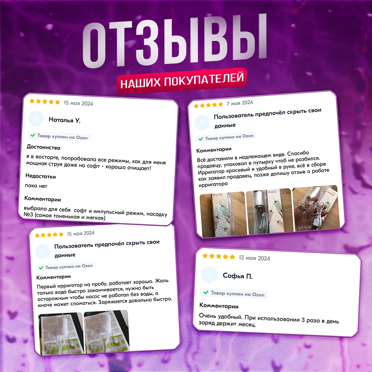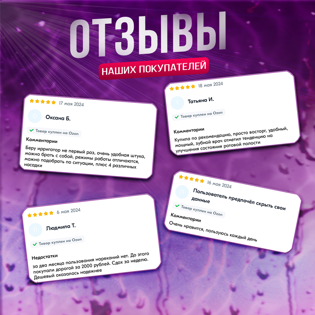 Ниже Вы можете прочитать отзывы на Ирригатор для зубов портативный с 4 насадками для полости рта и питанием от USB, ознакомится с подробными характеристиками, посмотреть интересные обзоры и фотографии на Ирригатор для зубов портативный с 4 насадками для полости рта и питанием от USB.