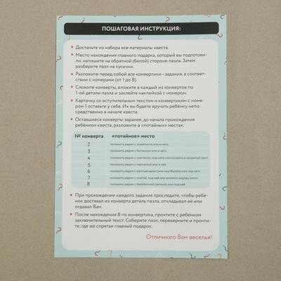 | Комплектация | пазл из 8 частей, вводная карточка, 8конвертиков с заданиями, наклейка для конвертиков и подсказок, инструкция |