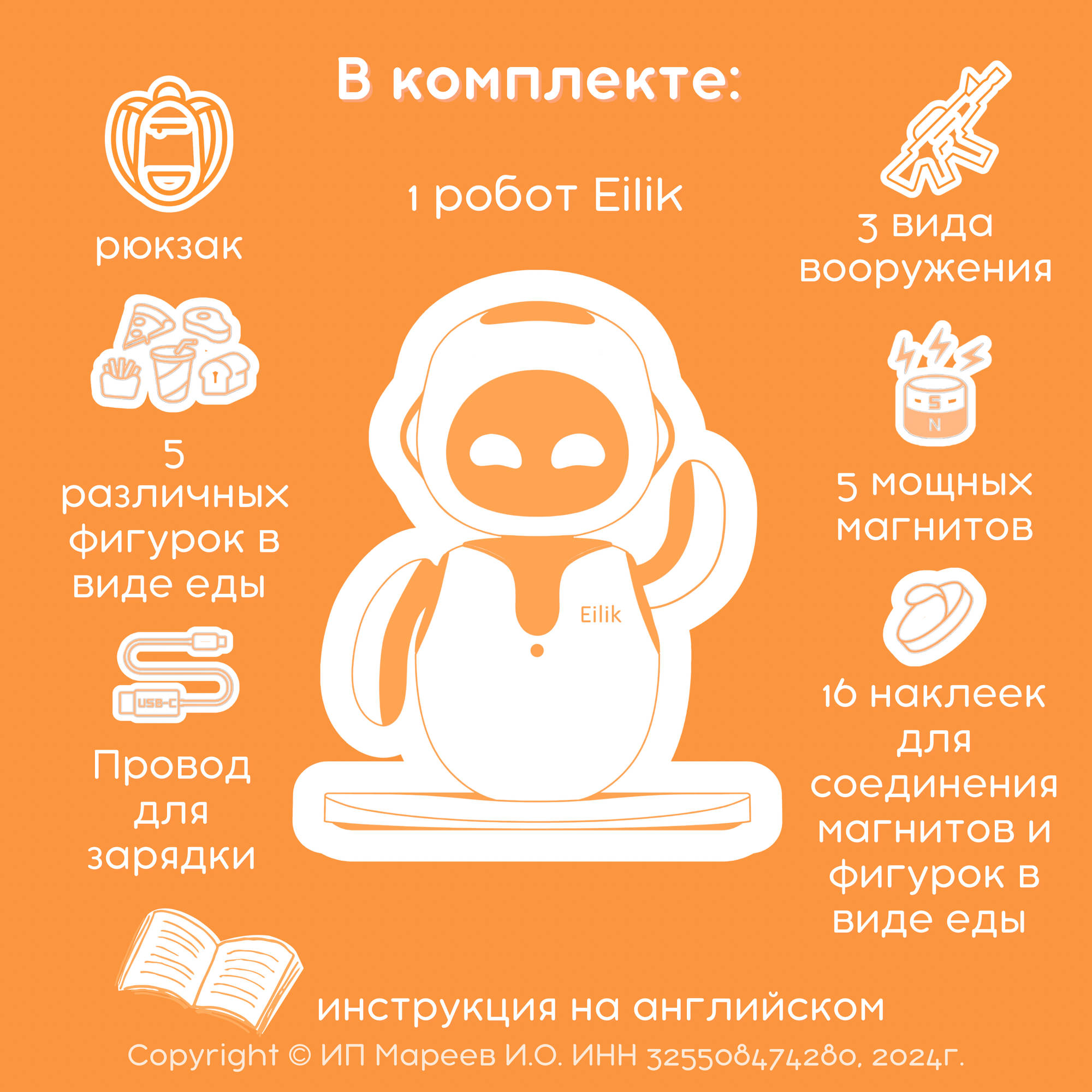 | Комплектация | В комплект входит робот Eilik 1шт, инструкция на английском языке, провод USB-C 1шт (блок на 5 Вольт в комплект НЕ ВХОДИТ), игрушки 5шт, магниты 5шт, наклейки для соединения магнита и игрушки 16шт, наклейки для блокнота. |