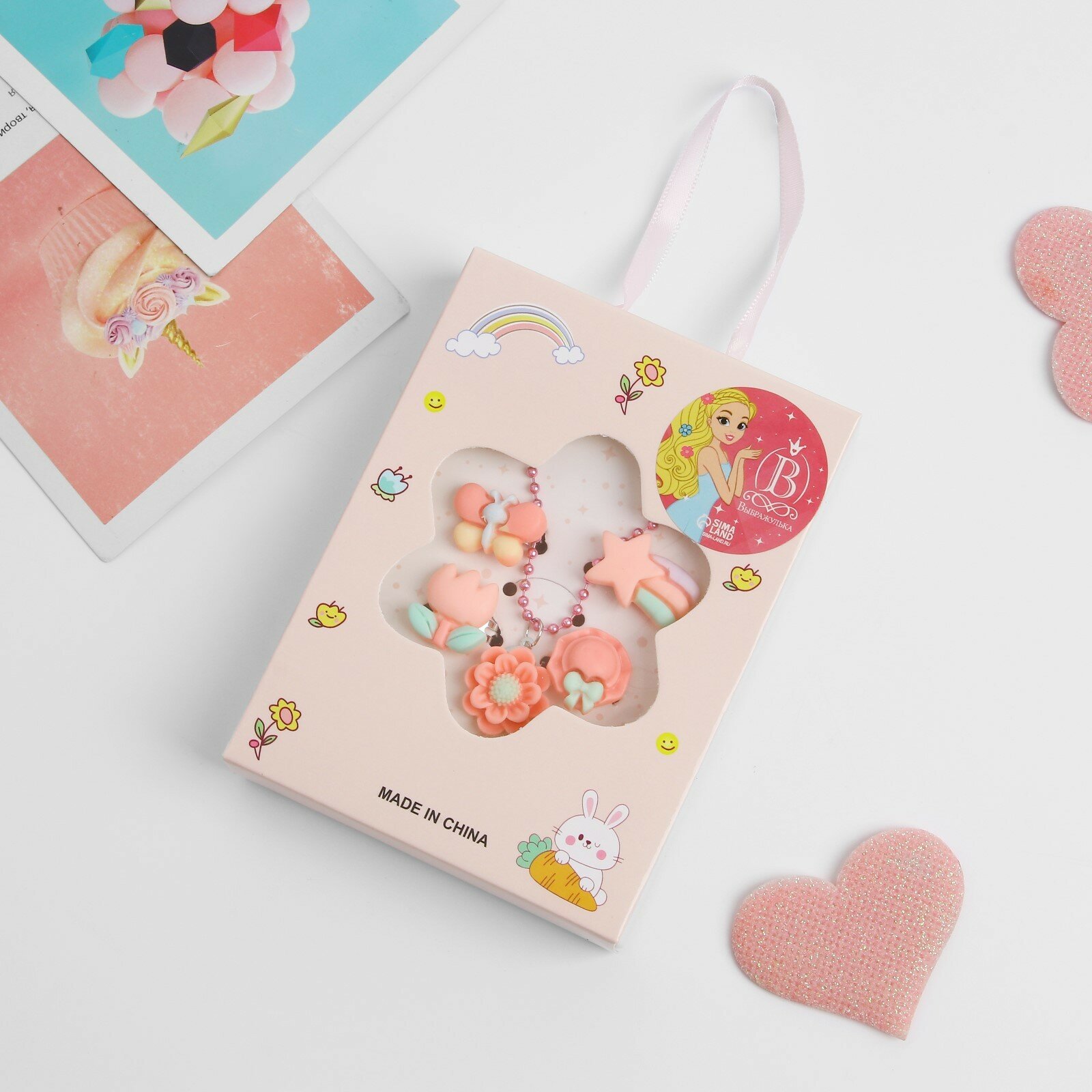 Набор детский «Выбражулька» 5 предметов: кулон, 4 кольца, фантазия, форма микс, цвет розовый, 9862520 интересное: