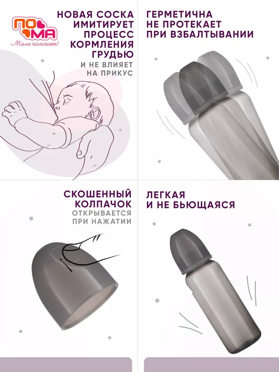 | Комплектация | бутылочка для кормления - 1 шт.;Антиколиковая соска - 1 шт.;колпачок - 1 шт. |