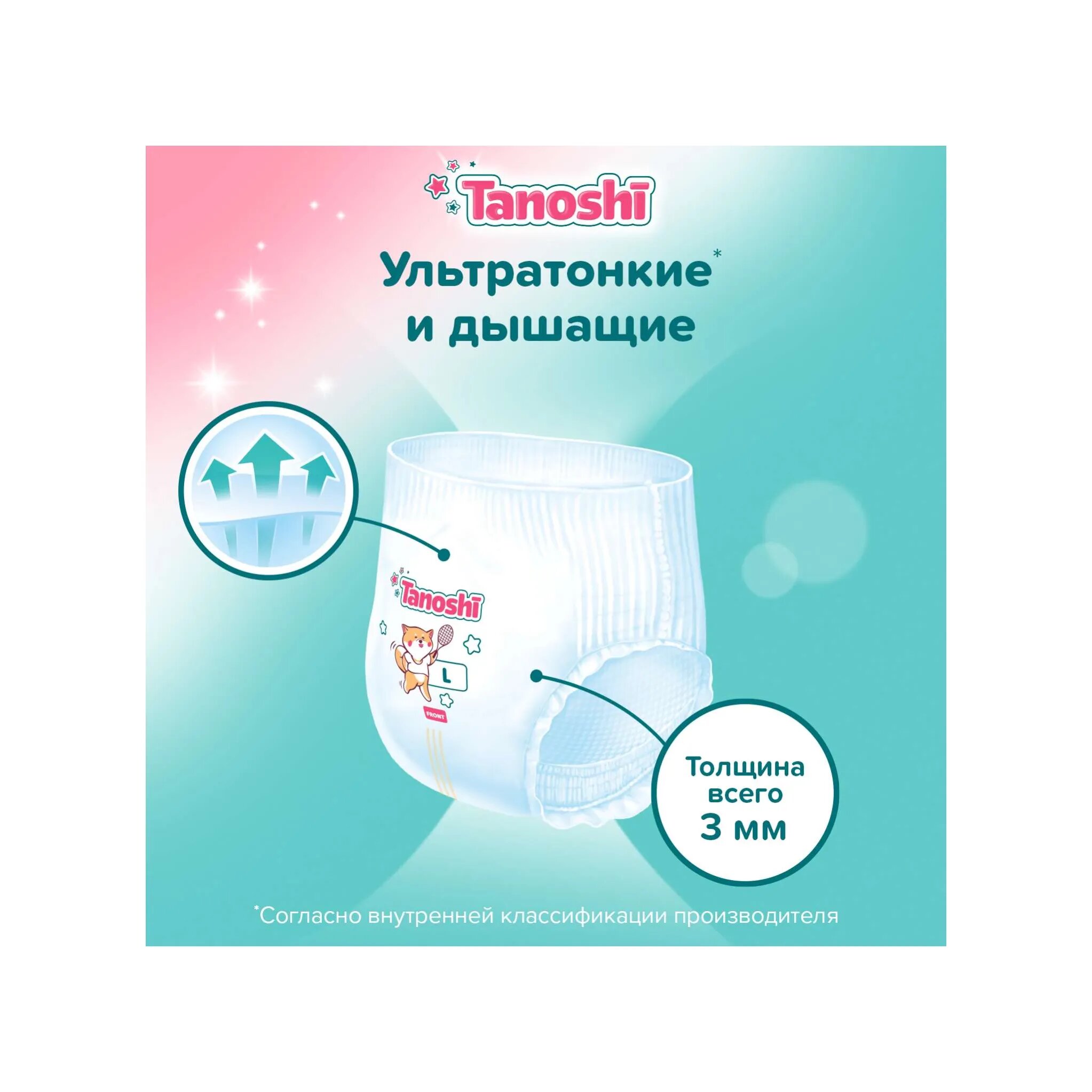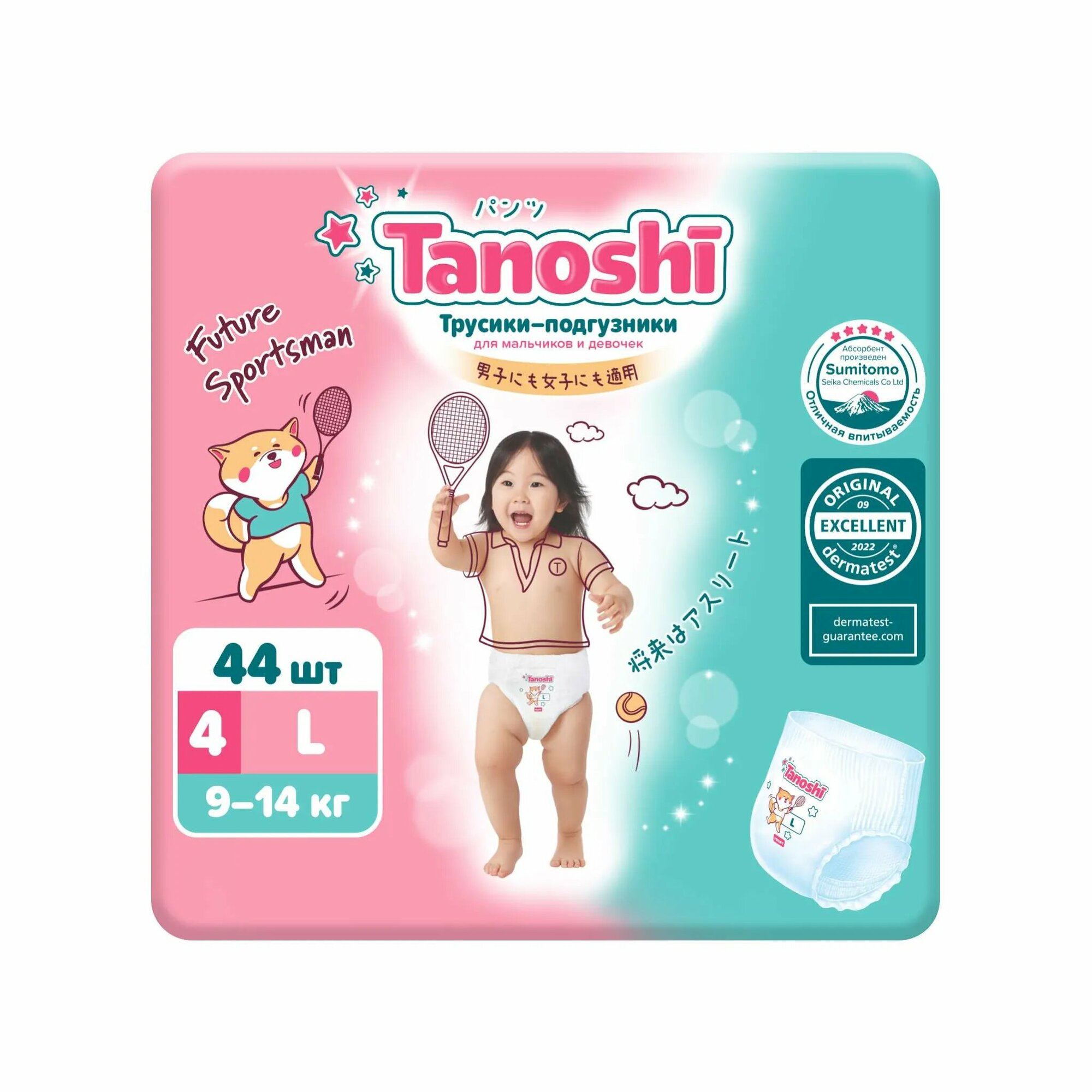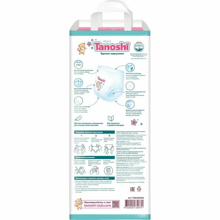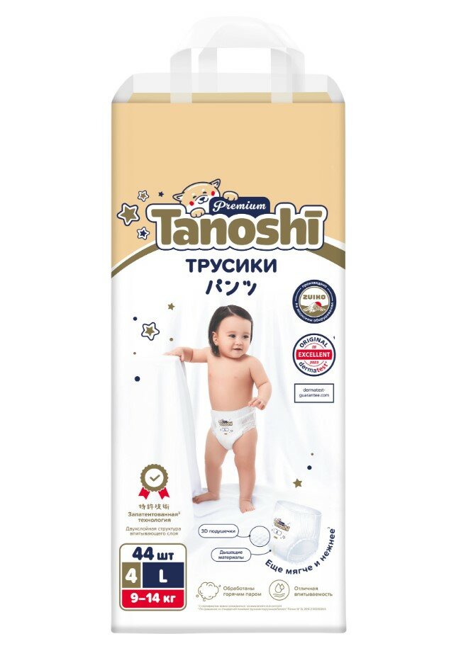 Подгузники-трусики Tanoshi Premium, размер L / 4 (9-14 кг) 44 шт., мягкие и тонкие интересное:
