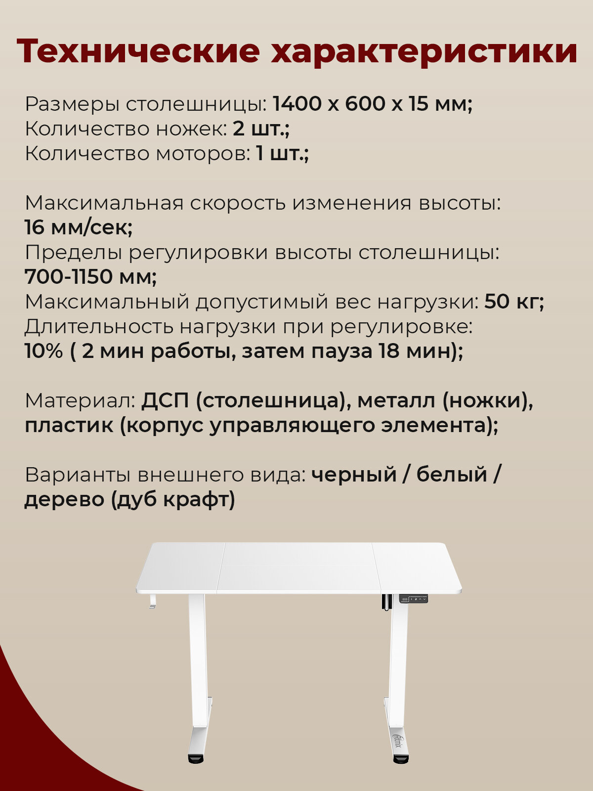 | Дополнительная информация | Размеры столешницы 1200х600х15 мм. Количество ножек 2 шт. Количество моторов 1 шт. Максимальная скорость изменения высоты 16 мм/сек. Пределы регулировки высоты столешницы 700-1150 мм. Максимальный допустимый вес нагрузки 50 кг. |