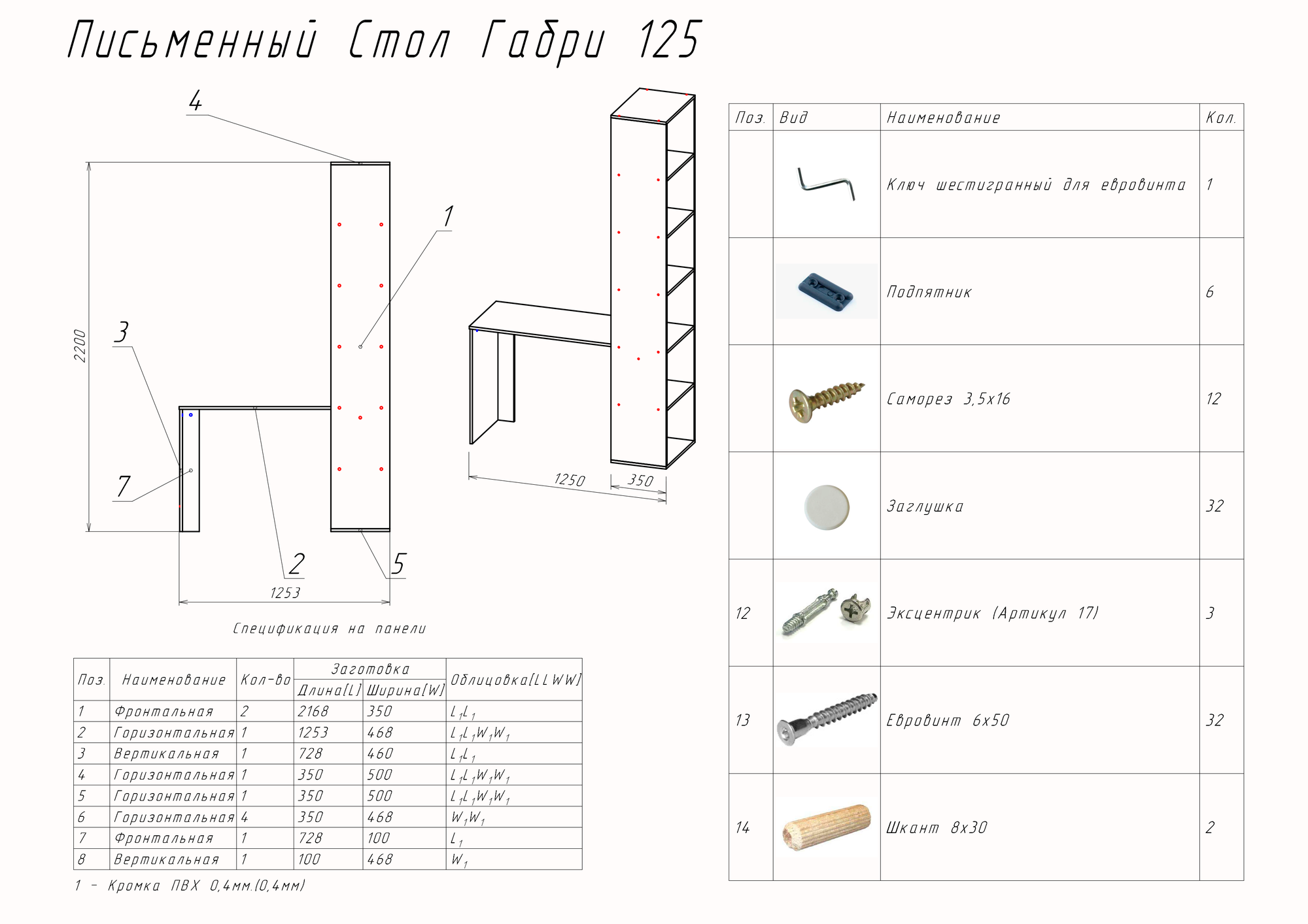 Письменный Стол Габри 125 Белый (ШхВхГ) 125х220х50см