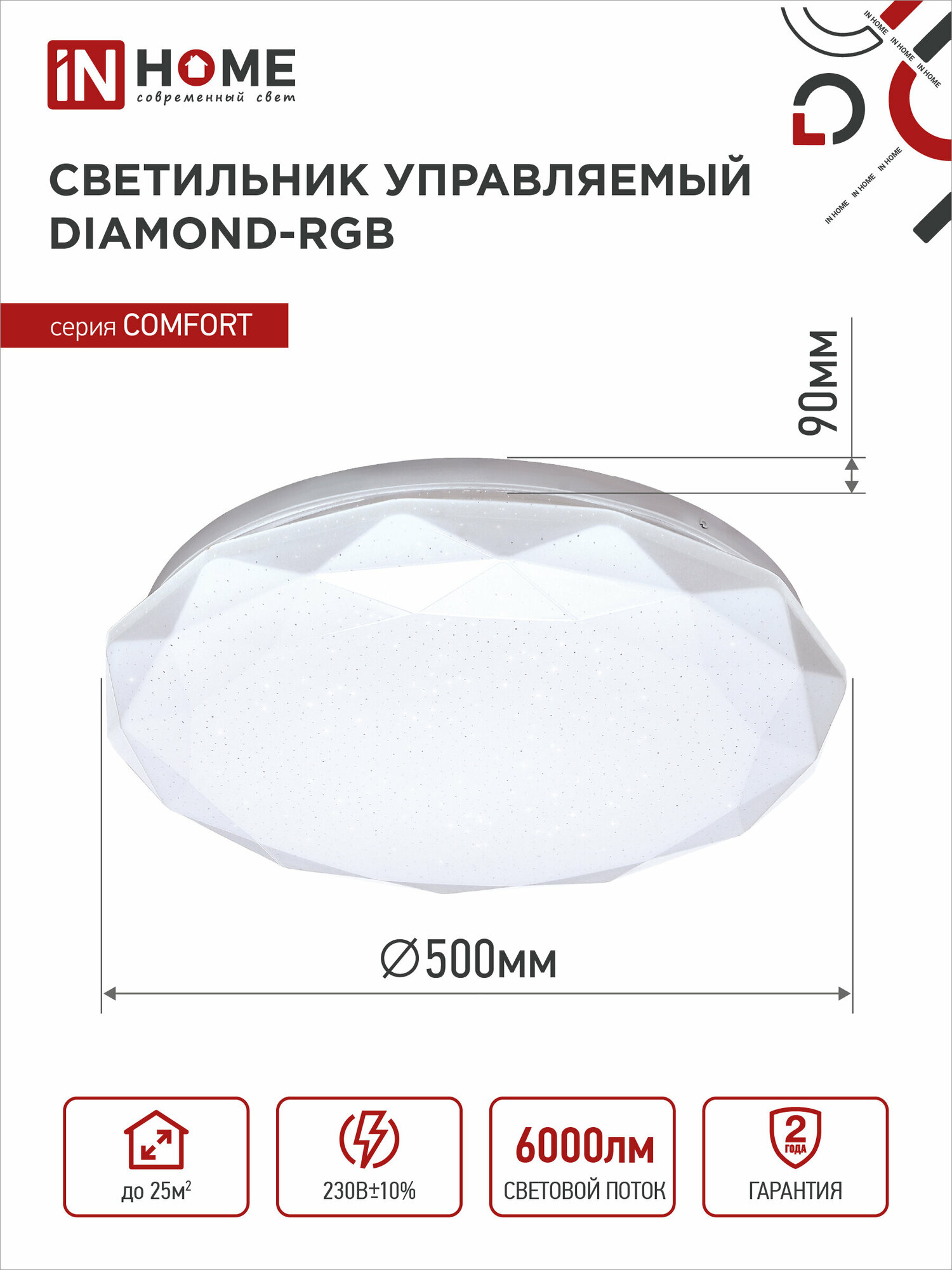 Светильник светодиодный COMFORT DIAMOND, RGB подсветка, 75Вт 230В 3000-6500К 6000лм, пульт ДУ, IN HOME