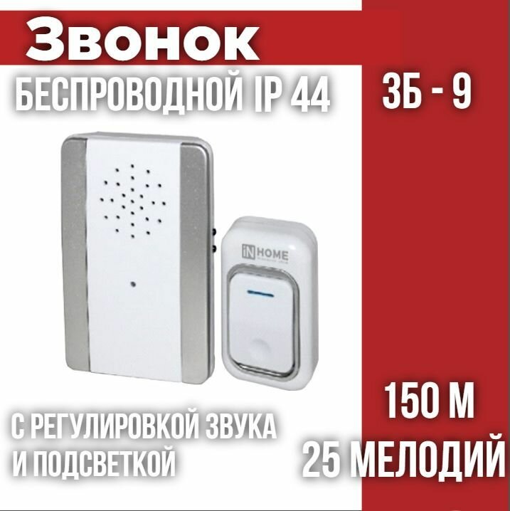 Купить Звонок беспроводной ЗБ-9 25 мелодий с регулировкой звука, подсветкой, 150м цифр. кодир. с кнопкой IP44 серебряно-белый IN HOME