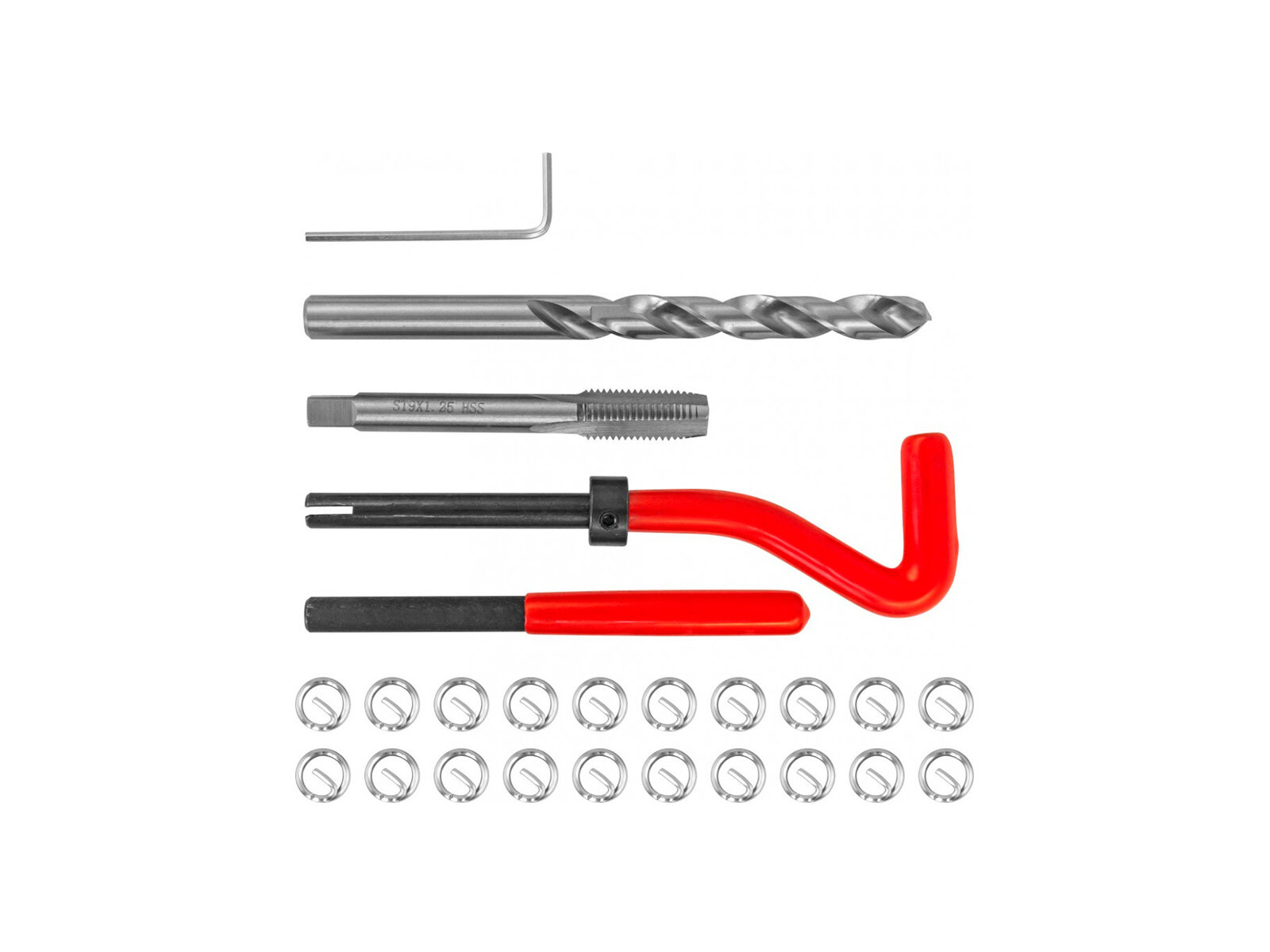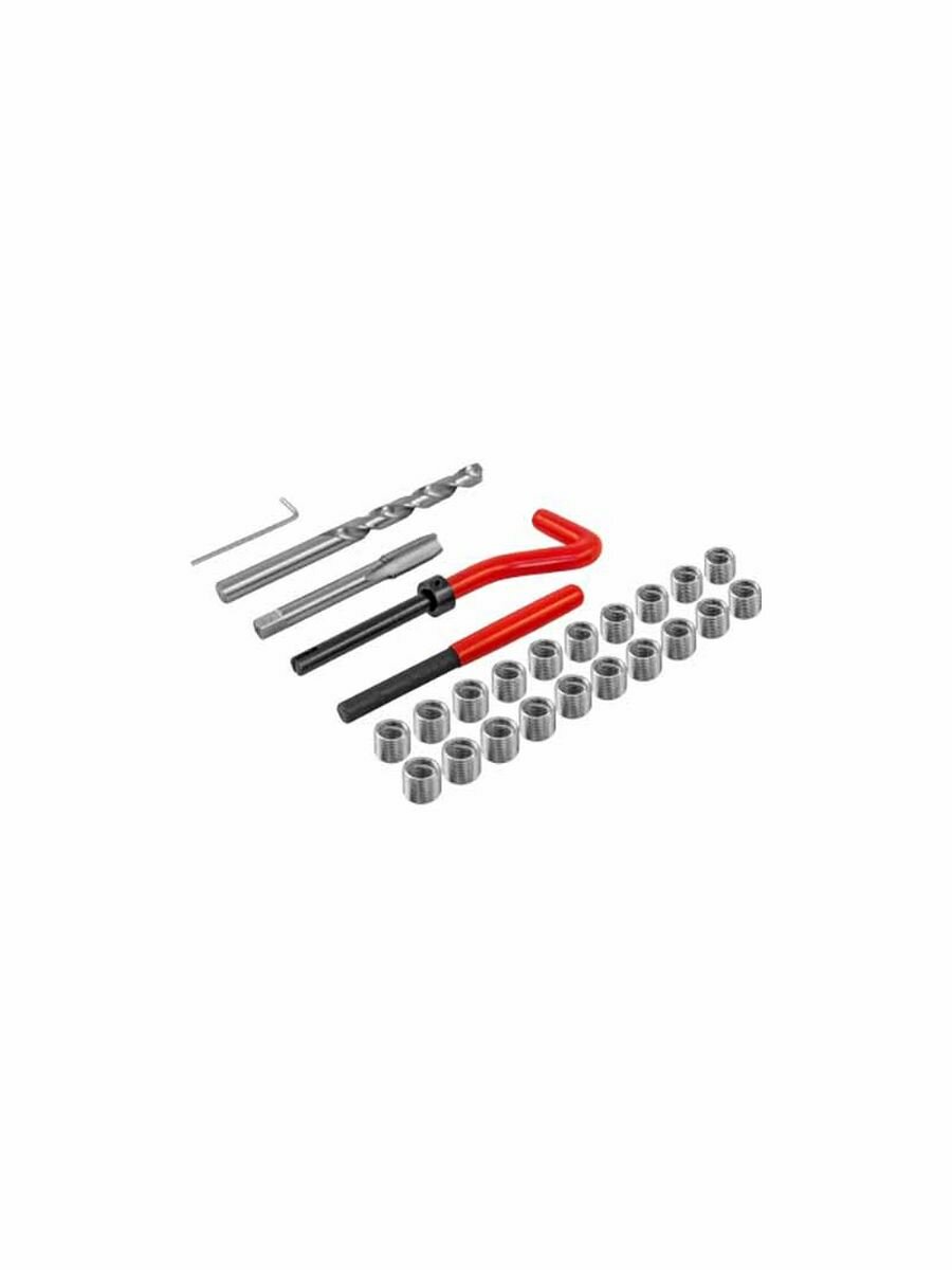 | Подробная комплектация | Сверло спиральное по металлу, по DIN 338 Метчик STI по DIN 8140-2Вороток установочный (с предохранительным кольцом для ограничения глубины)Демонтажная оправка (для удаления поводка) Ключ торцевой шестигранный Резьбовые вставки (25 шт.) |