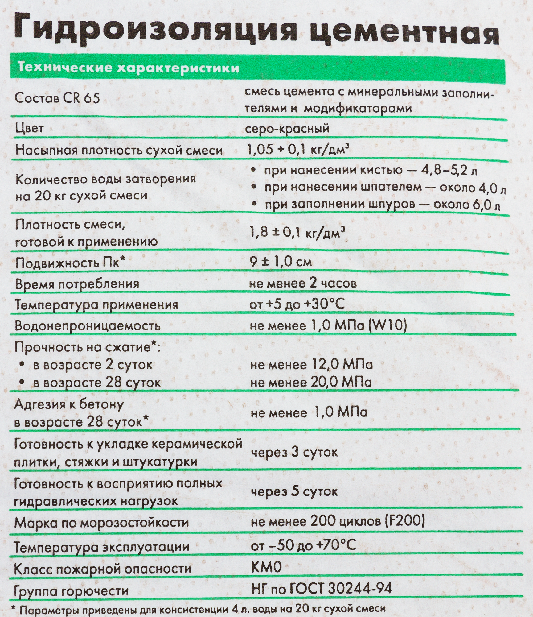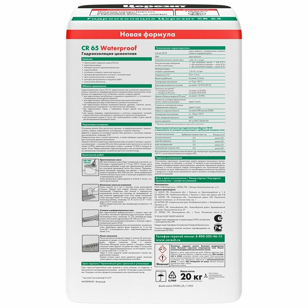 | Дополнительная информация | Может применяться: для наружной и внутренней гидроизоляции заглубленных и подземных сооружений (в т.ч. в сочетании с санирующими штукатурками Ceresit); для гидроизоляции небольших монолитных ванн крытых бассейнов и резервуаров для воды хозяйственно-питьевого назначения; для гидроизоляции влажных помещений (ванных, душевых, туалетов, кухонь, промышленных помещений и т.д.) в т.ч в системе «теплый пол» под плиточную облицовку; для защиты градирен, гидротехнических и очистных сооружений, тоннелей и других бетонных конструкций от увлажнения и морозного разрушения; для заполнения шпуров и пустот при инъектировании кладок старых зданий (см. CO 81). Гидроизоляцию следует защитить от механических повреждений плиточной облицовкой или не содержащими гипс штукатуркой или стяжкой. |