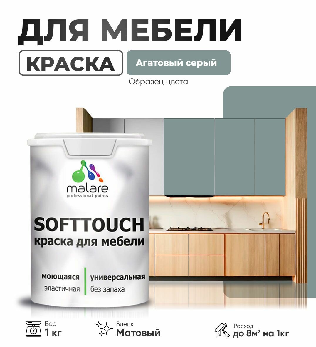Купить Акриловая краска для мебели Malare SoftTouch для кухонных фасадов для дерева и МДФ, моющаяся быстросохнущая, матовая, агатовый серый, 1 кг.