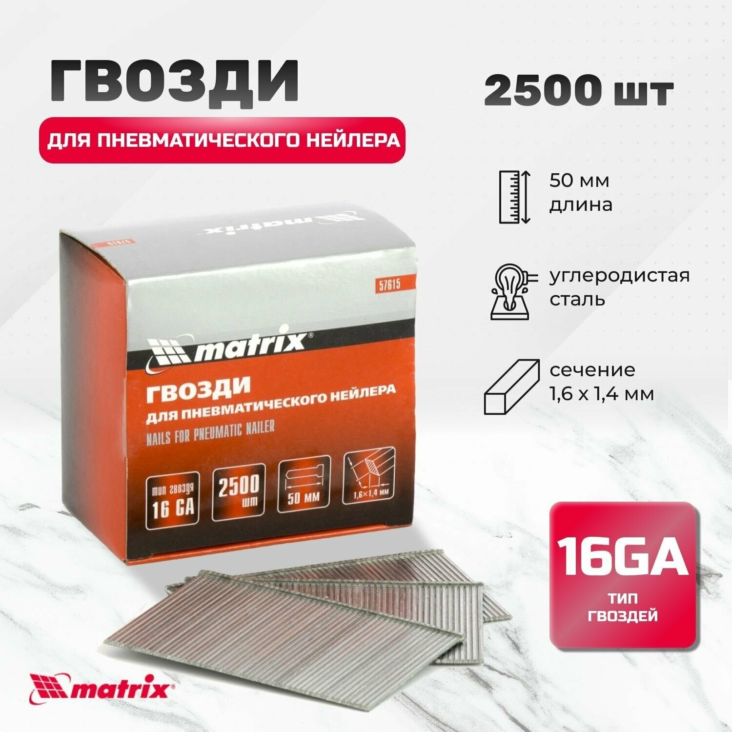 Купить Гвозди Matrix 57615 16ga для пневматического нейлера сечение 1.6х1.4 длина 50мм 2500шт 57615