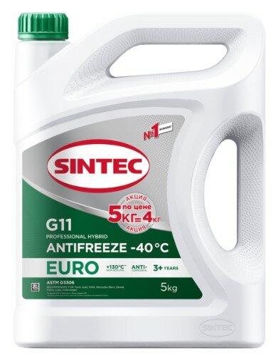 Антифриз Sintec Euro Зеленый G11 (-40) 5 Кг Акция 5 Кг По Цене 4 Кг SINTEC арт. 990580