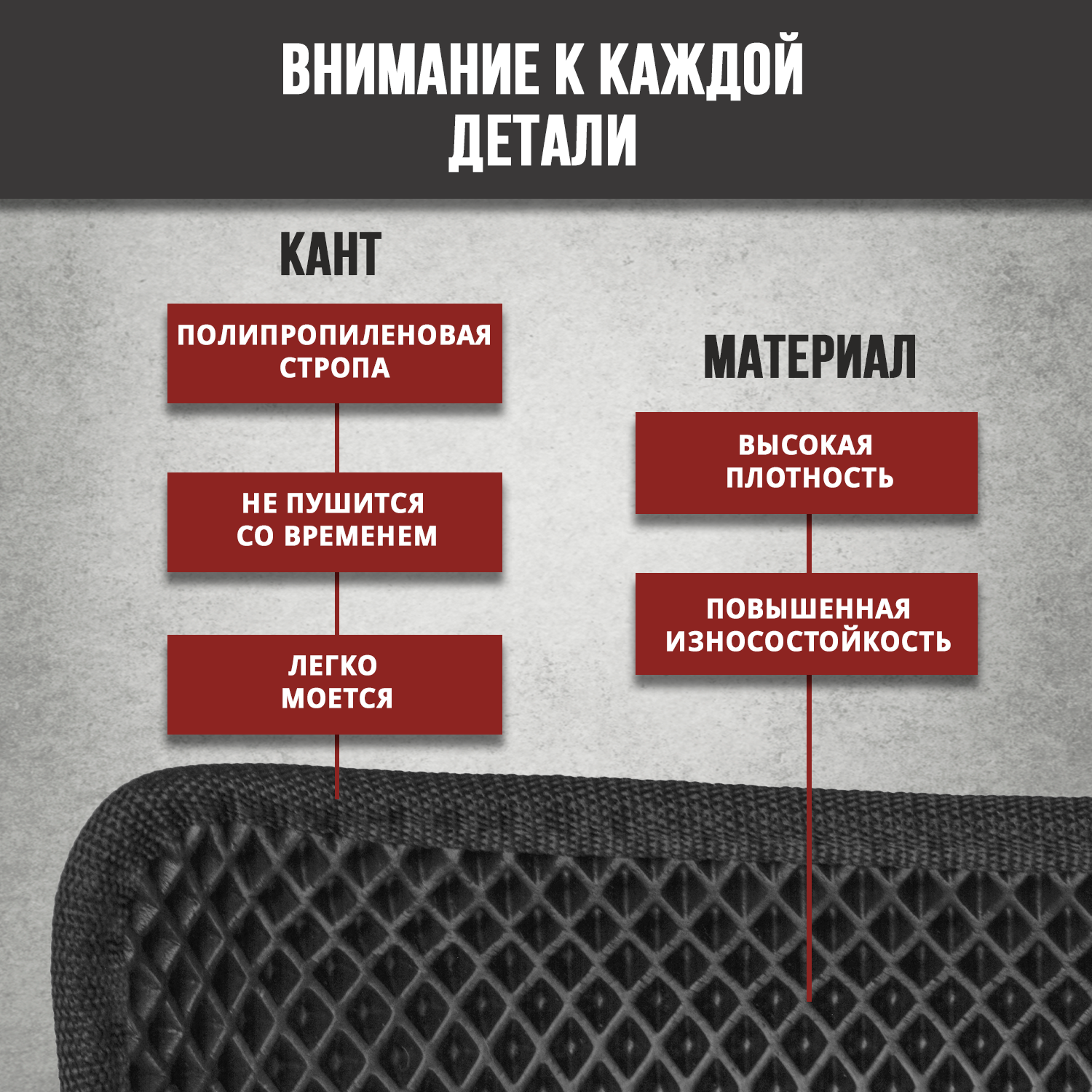 | Подробная комплектация | 2 передних коврика; 2 задних коврика; 1 перемычка; липучка на каждом коврике; штатные крепления. |
