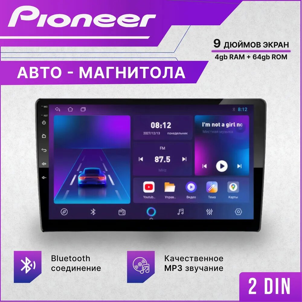 Магнитола Pioneer для автомобиля Android, 2 din, 9 дюймов. Автомагнитола WIFI, Bluetooth, GPS-навигация, MP5-плеер. Магнитофон в машину с сенсорным экраном+ защитное стекло и камера заднего вида в подарок