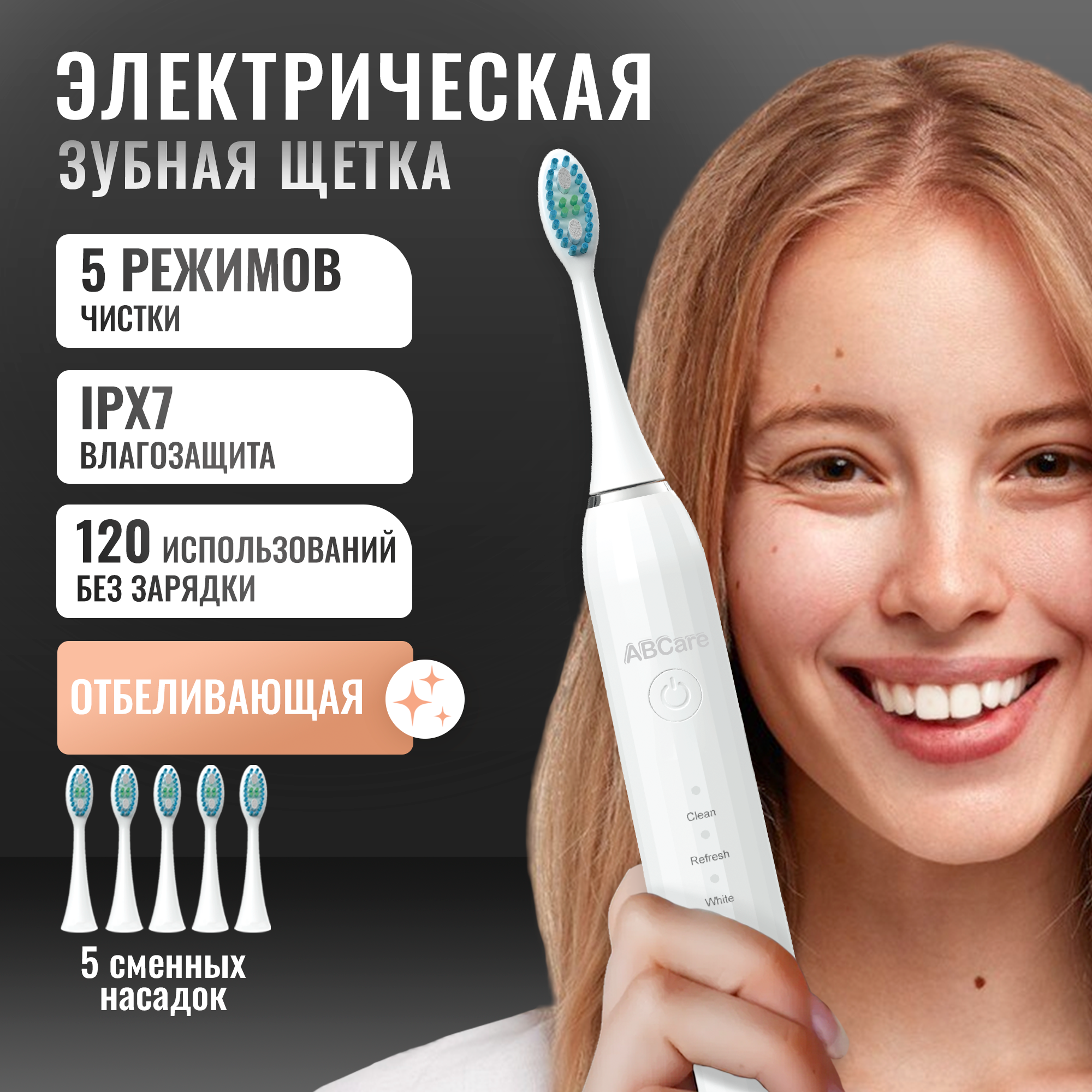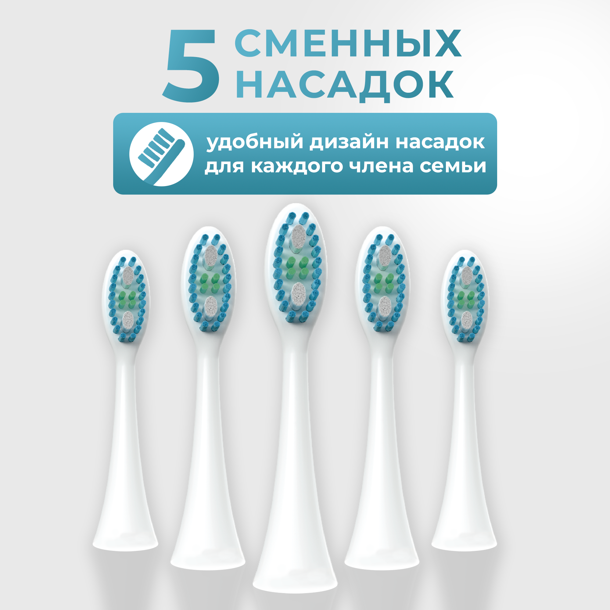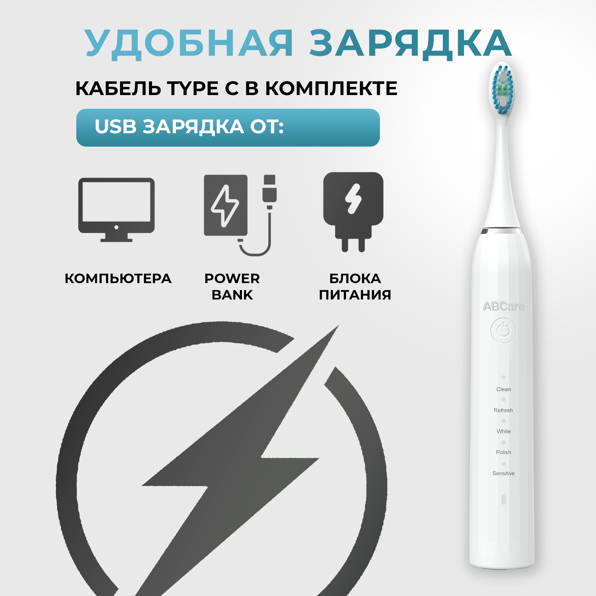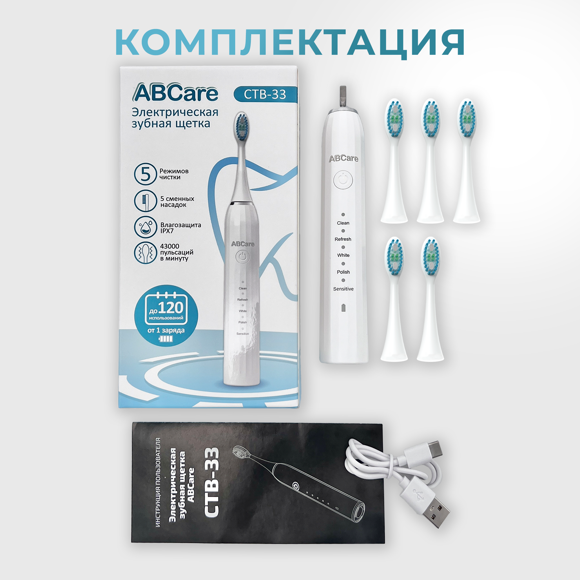 Электрическая зубная щетка, ABCare, CTB-33, 5 режимов работы, 5 насадок, зубная щетка электрическая, электрощетка зубная, как Oral-B, B.Well, белая