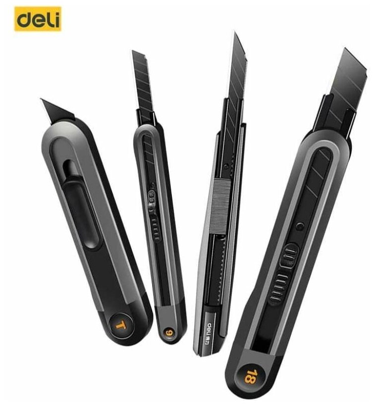 Купить Технический строительный нож "Home Series Black" Deli HT4008 (Т-образное лезвие, эксклюзивный дизайн, софттач пластик, безопасная конструкция, подарочная упаковка)