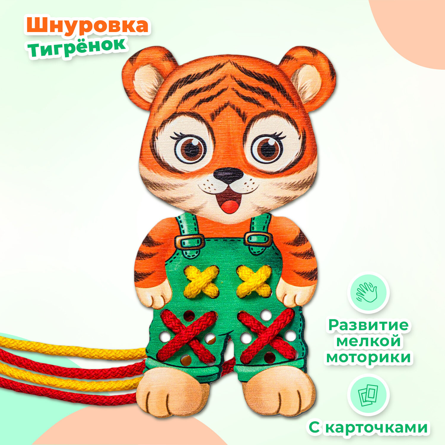 Развивающая игра из дерева Шнуровка с карточками примерами "Тигренок"