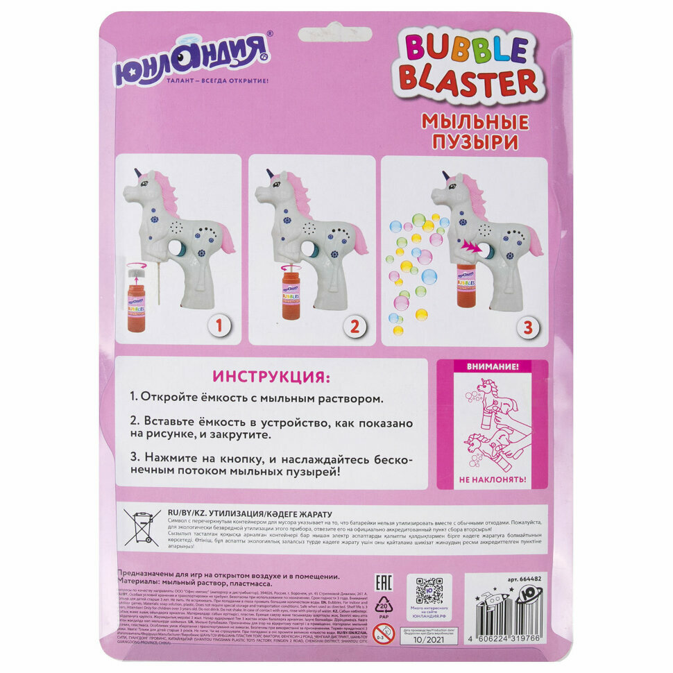 Мыльные пузыри "Пистолет автоматический единорог", с подсветкой, 60 мл, юнландия, 664482 интересное: