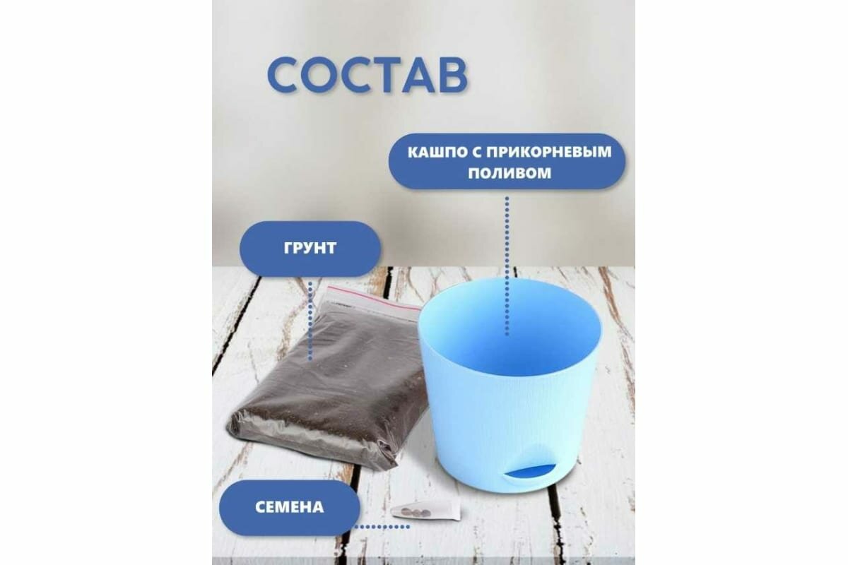 | Комплектация | пластиковый горшок объемом 0,4 литра с системой прикорневого полива, семена, плодородный грунт |
