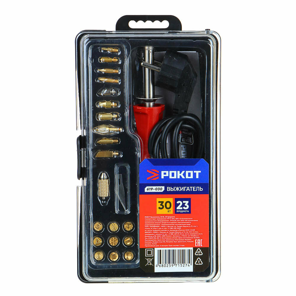 Рокот Выжигатель 30 Вт, 23 предмета, насадки для выжигания, жала разной формы и диаметра