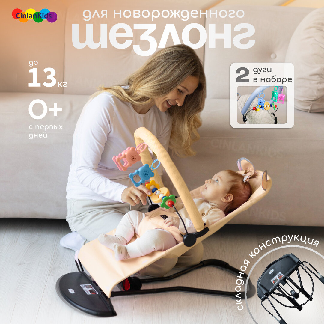 Кресло шезлонг детский для новорожденных с игрушкой дугой, бежевый, CINLANKIDS интересное: