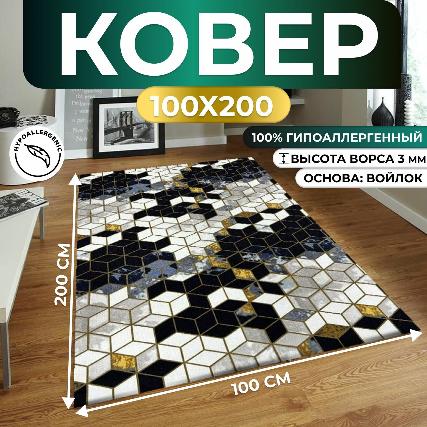Ковер для дома, палас "Кубик" 200х400 см