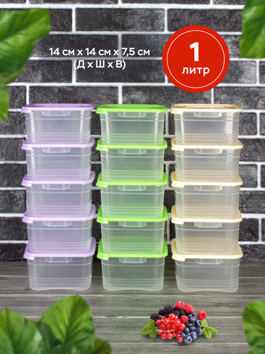 Набор пластиковых контейнеров для хранения и заморозки, Ангора, 1литр, 15 штук, салатовый + сиреневый + кремовый интересное: