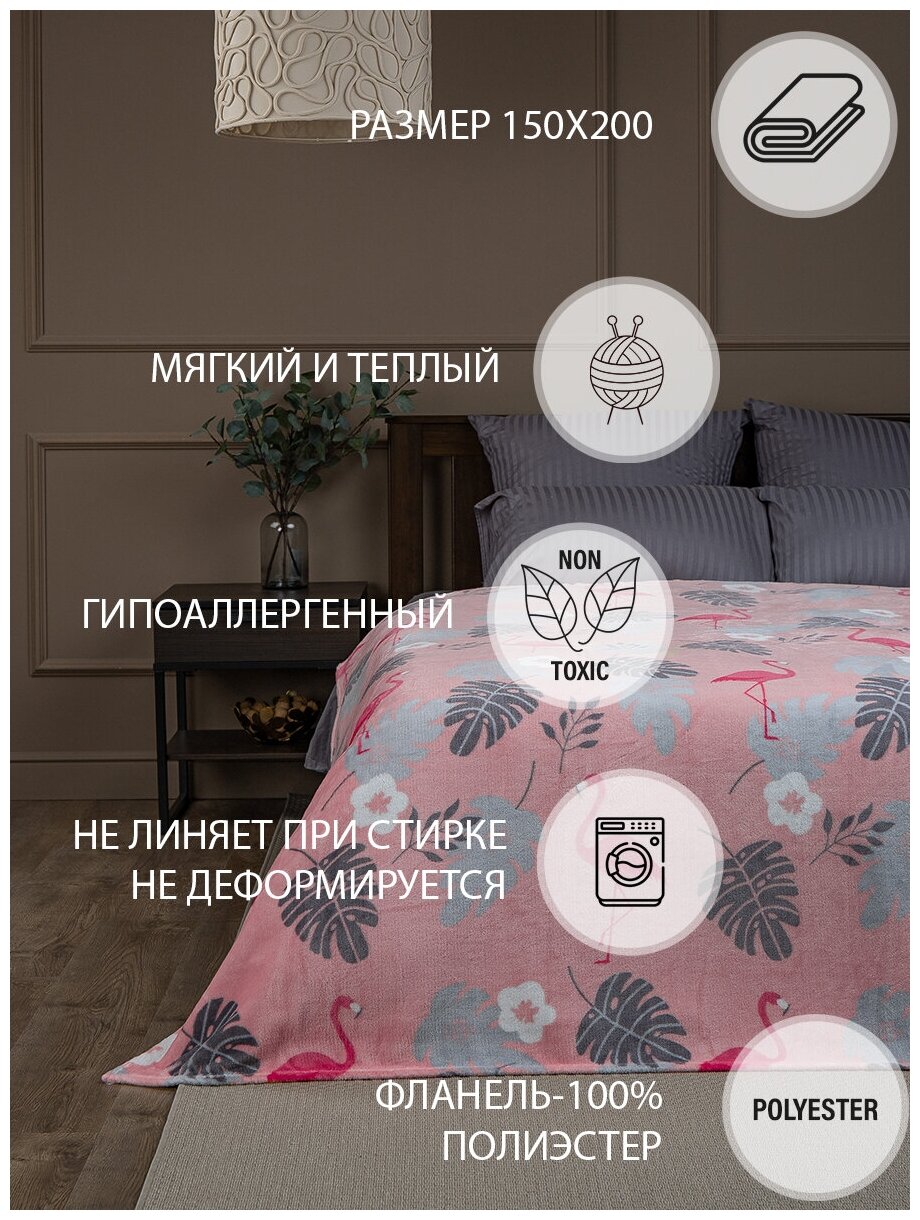 Купить Плед TexRepublic Absolute Фламинго 150х200 1,5 спальный, покрывало на диван фланель мягкий розовый, серый