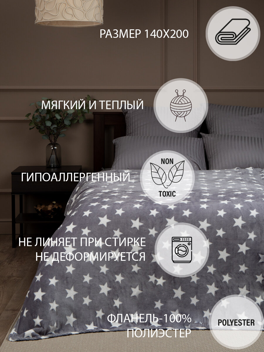 Купить Плед TexRepublic Absolute Звёзды Фланель 140х200 см покрывало на диван кровать с рисунком Серый / белый