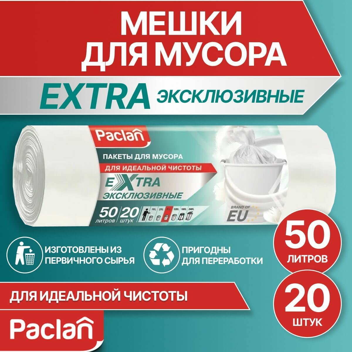 Мешки для мусора Paclan Extra, сверхпрочные, полиэтилен, 50л, 20шт