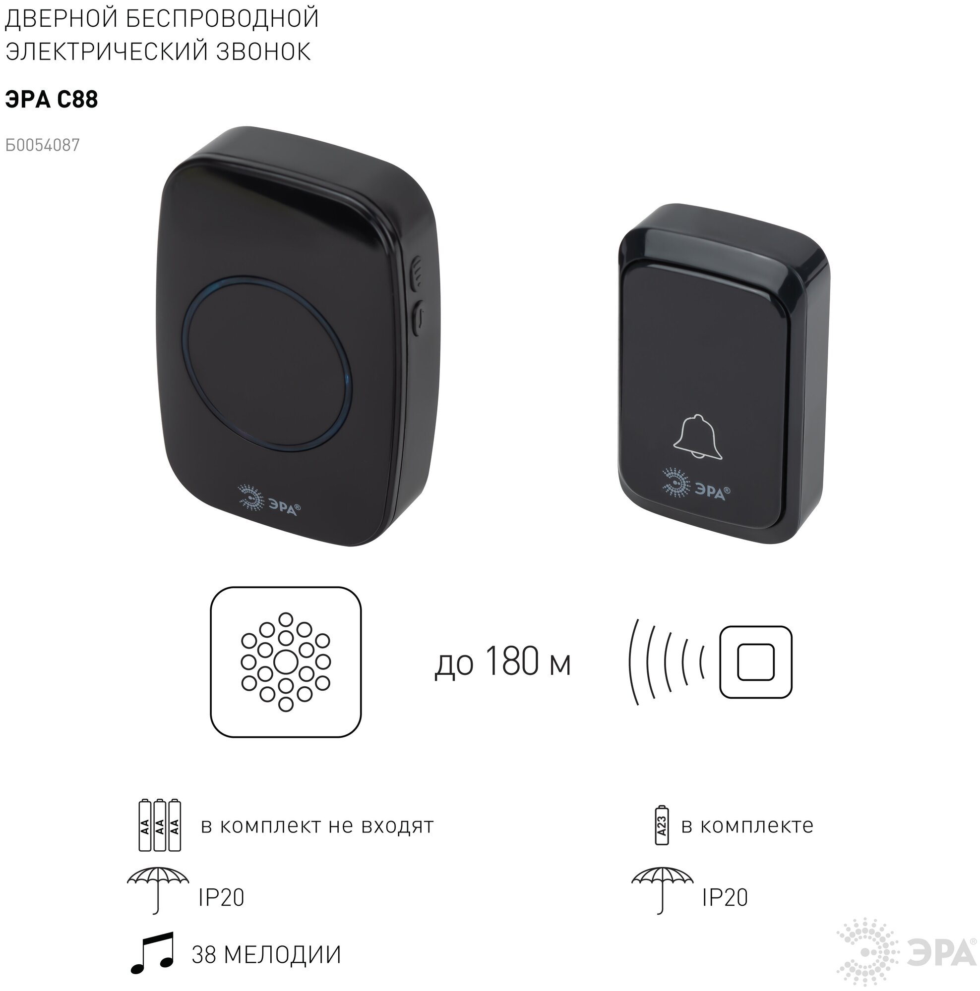 Звонок дверной ЭРА С88 беспроводной, от сети, черный, 36 мелодий