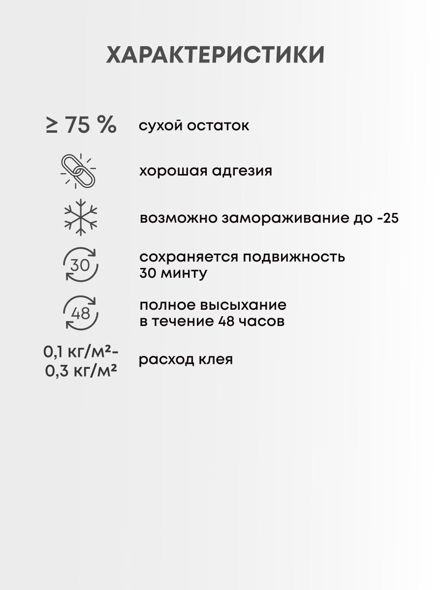 | Дополнительная информация | может применяться в качестве высококлассной финишной шпатлёвки и для приклеивания кафельной плитки; имеет хорошую адгезию к дереву, бетону, кирпичу, штукатурке, стеклу и др.; состав: водная дисперсия акрилового сополимера, наполнитель, модифицирующие добавки |