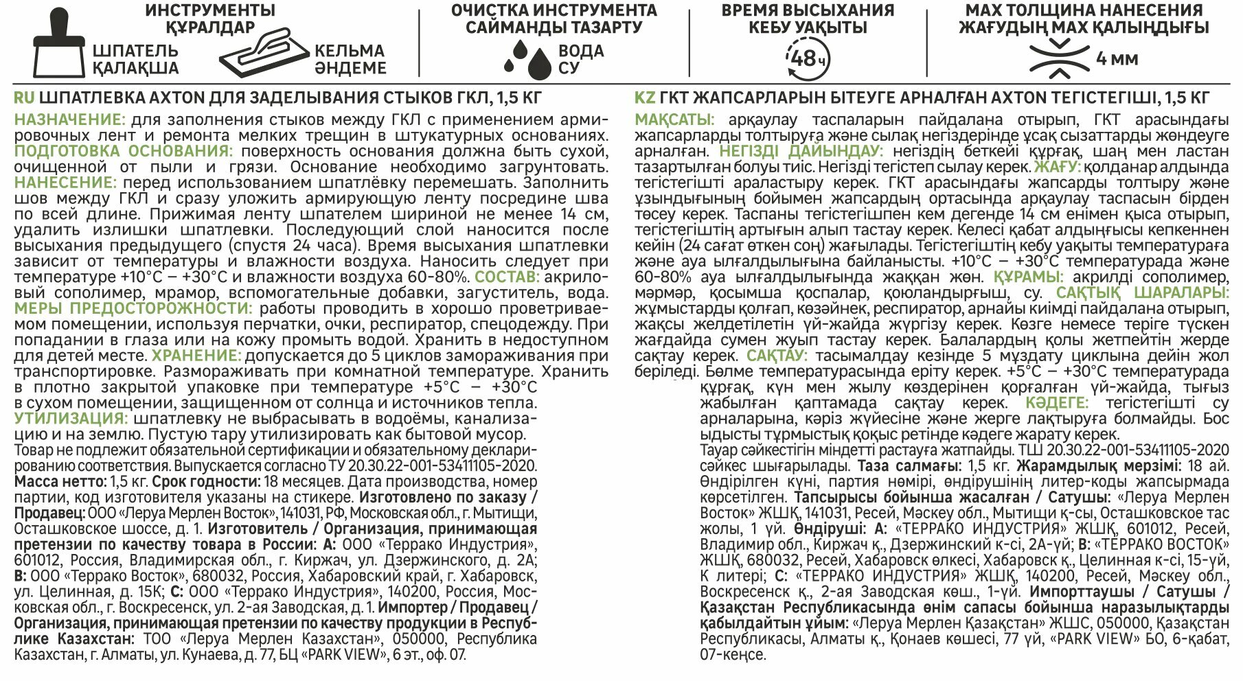 Акстон шпатлевка для стыков гипсокартона белая (1,5кг) / AXTON шпатлевка для стыков ГКЛ для внутренних работ белая (1,5кг)