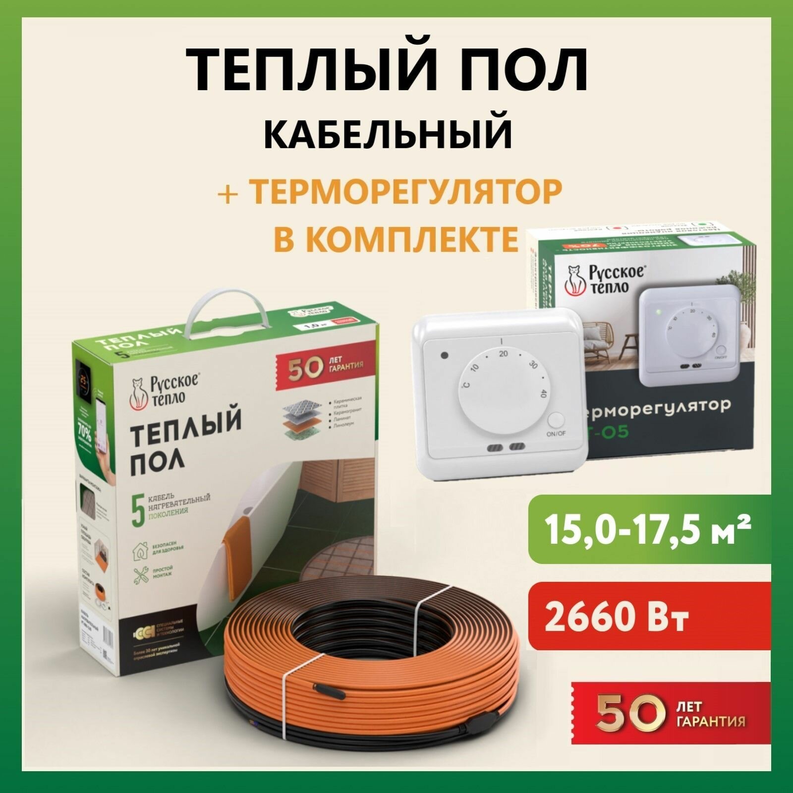 Теплый пол нагревательный кабель электрический "Русское тепло" 135м (2660 Вт) с терморегулятором РТ-15