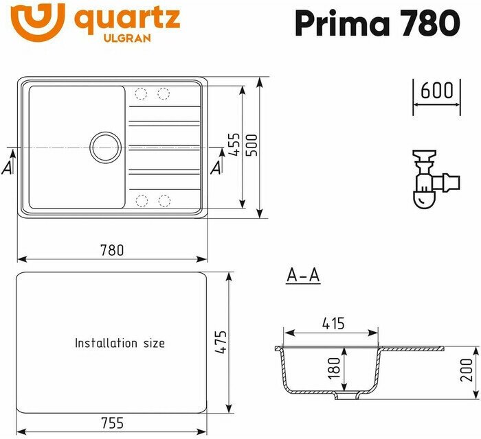Мойка ULGRAN Quartz Prima 780-03, десерт