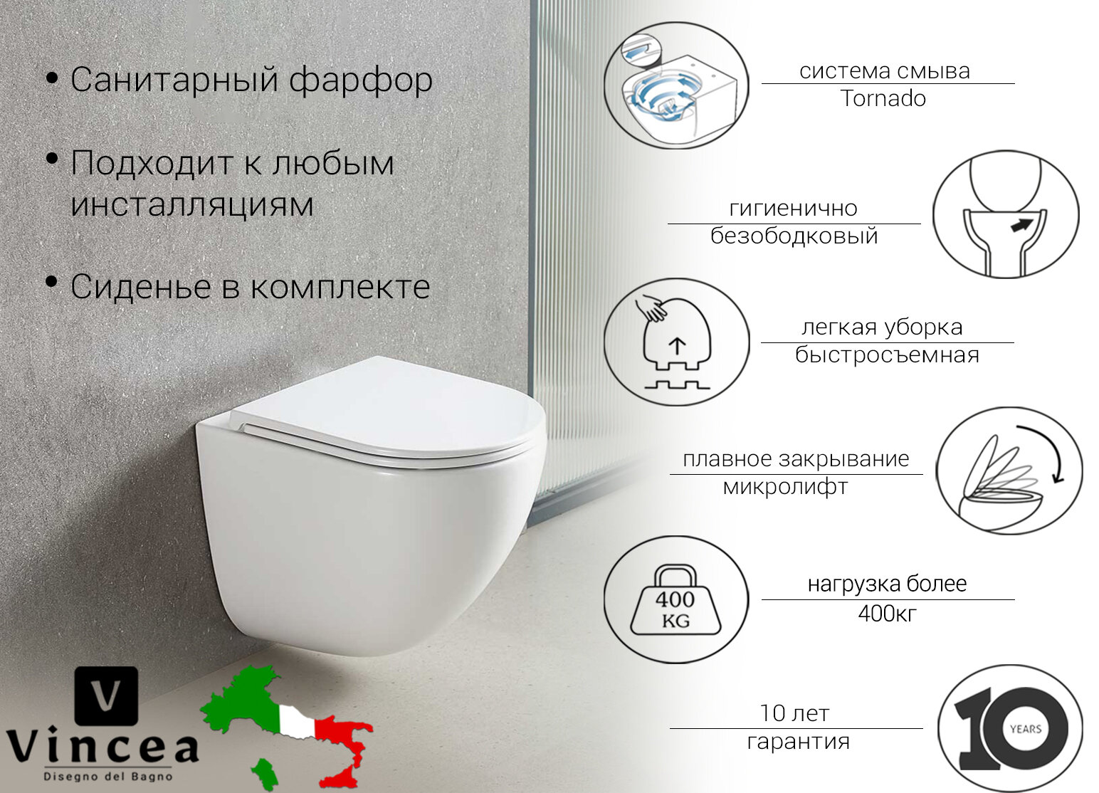 Vincea Унитаз подвесной Tornado Bien VT1-51T, цвет белый, ультратонкое soft-close сиденье