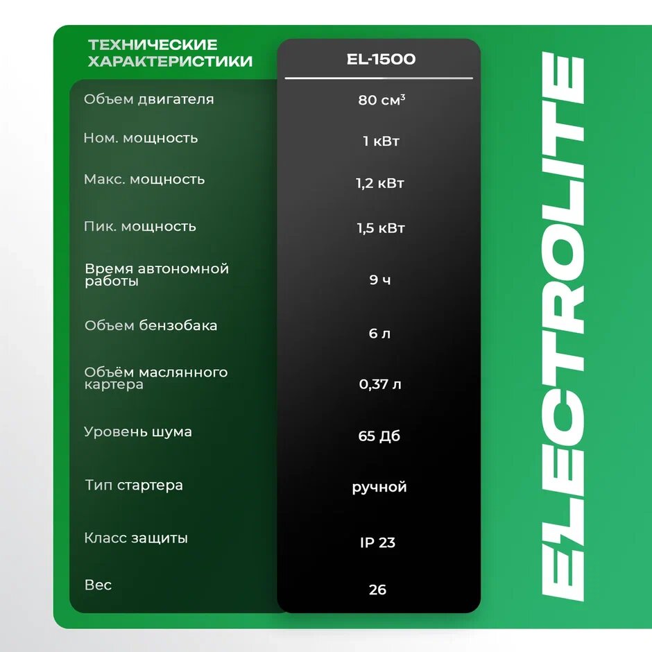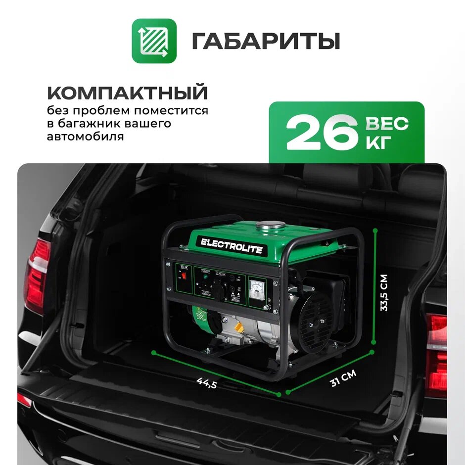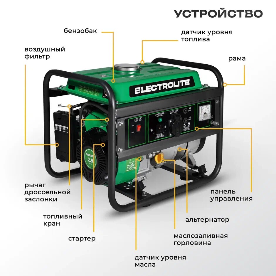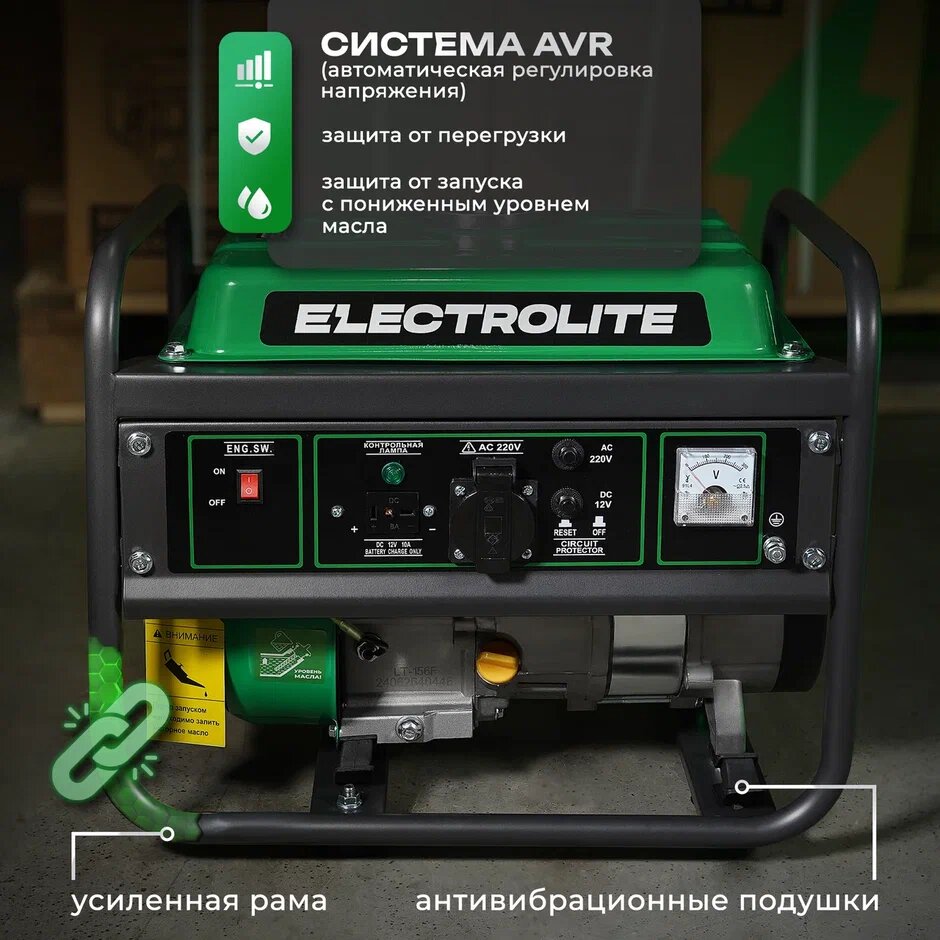 Генератор бензиновый Electrolite 1500 (1.875 кВа максимальная нагрузка , 220 В / 12 В, 1 / 1.2 кВт, ручной стартер) интересное: