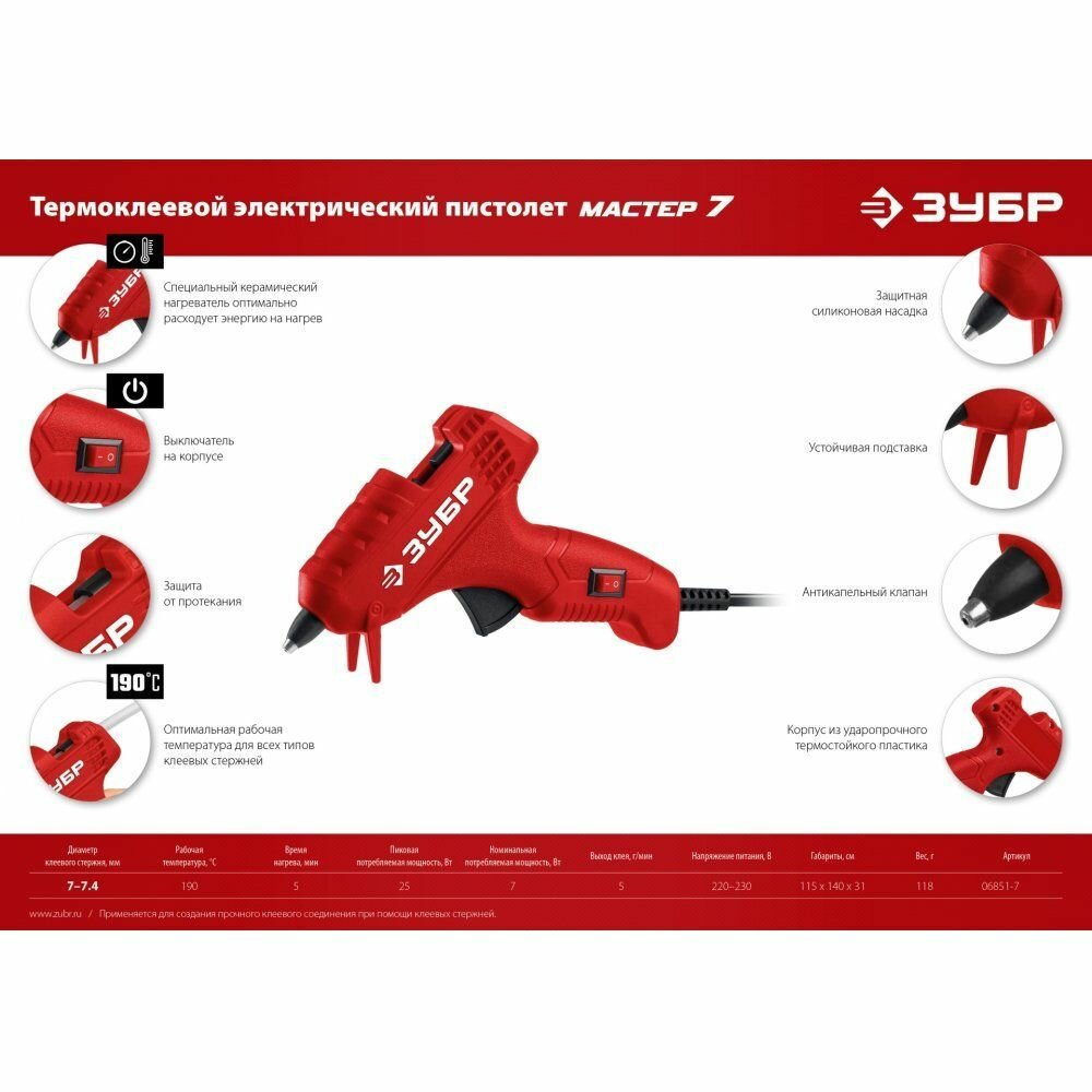 ЗУБР d 7 мм, 5 г/мин, Термоклеевой пистолет электрический, Мастер 7 (06851-7)