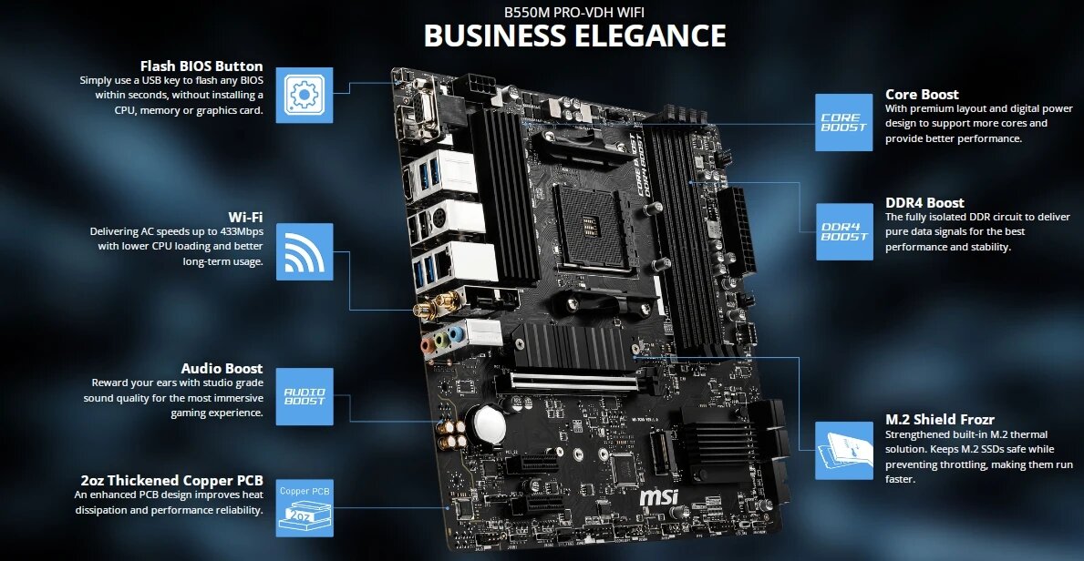 MSI Материнская плата SocketAM4 MSI B550M PRO-VDH (AMD B550, 4xDDR4, M.2, SATA III, RAID, PCI-E, D-Sub, HDMI, DP, 1Гбит LAN, USB3.2, mATX) (ret) интересное: