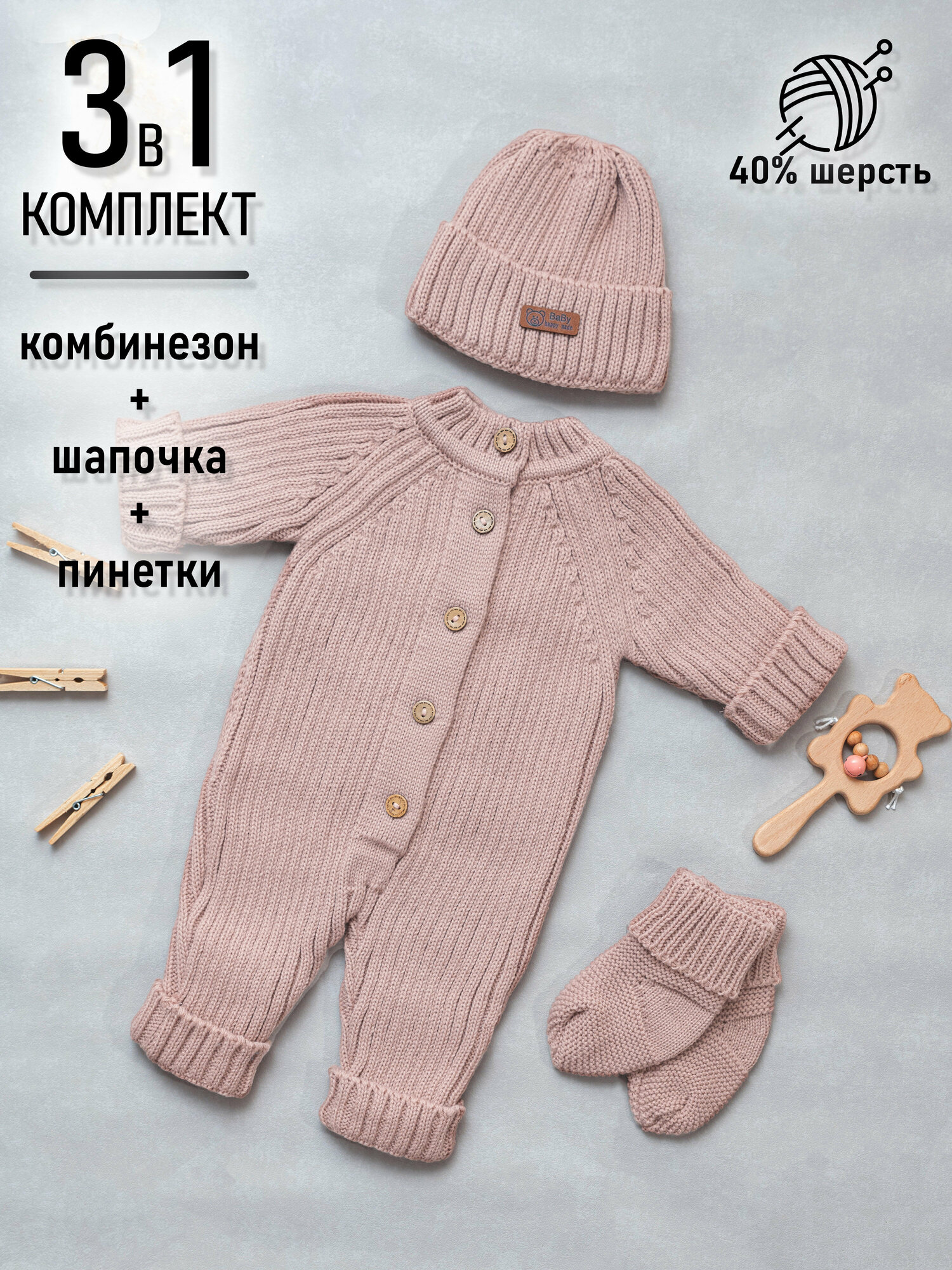 Купить Вязаный комбинезон для новорожденного пудровый 62-68