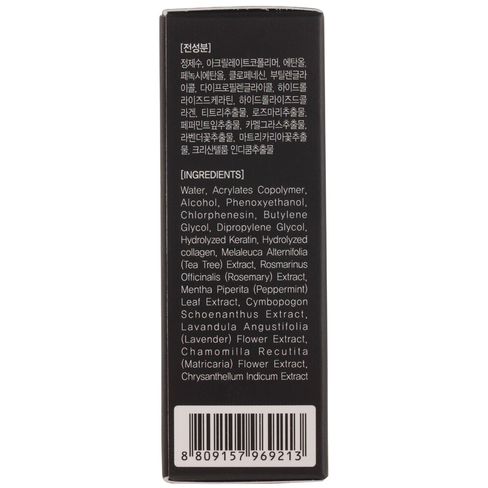 | Состав | water, acrylates, сopolymer, alcohol, phenoxyethanol, chlorphenesin, butylene glycol, dipropylene glycol, hydrolyzed keratin, hydrolyzed collagen, melaleuca alternifoli (tea tree) extract, rosmarinus officinalis rosemary) extract, mentha piperita (peppermint) leaf extract, cymbopogon schoenanthus extract, lavandula angustifolia (lavender) flower extract, сhamomilla recutita (matricaria) flower extract, chrysanthemum indicum extract |