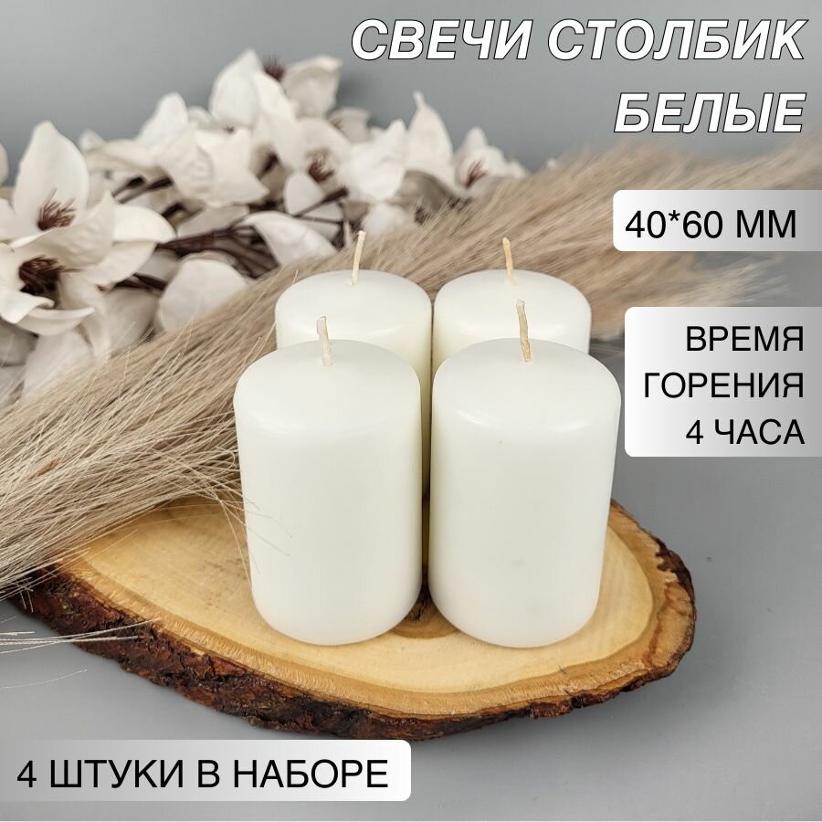 Свеча столбик/бочонок 40х60 мм, белая, время горения 4 часа, 4 шт. в наборе интересное: