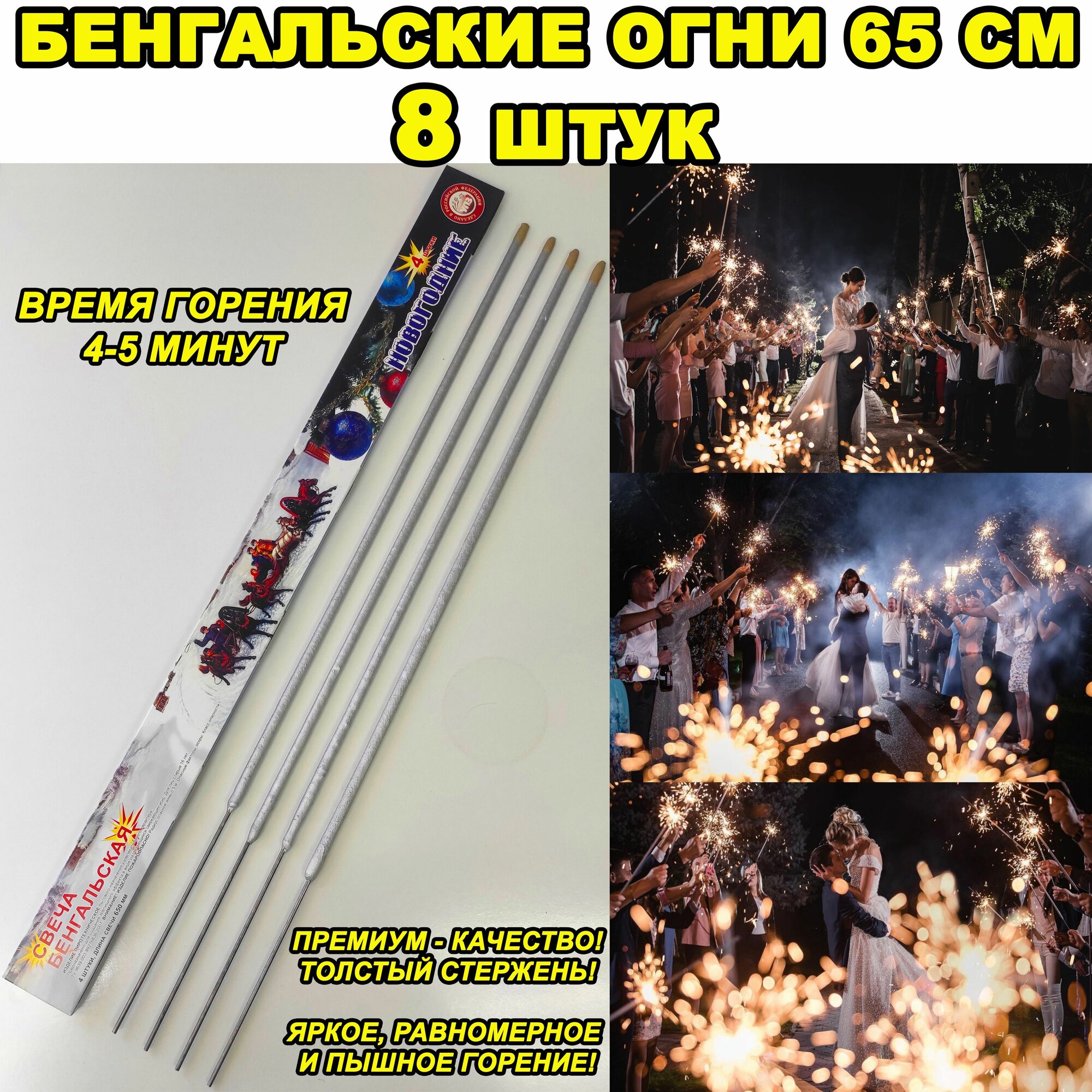 | Комплектация | Бенгальские Огни 65см 8 штук. 2 упаковки по 4 штуки в каждой упаковке = 8 штук |