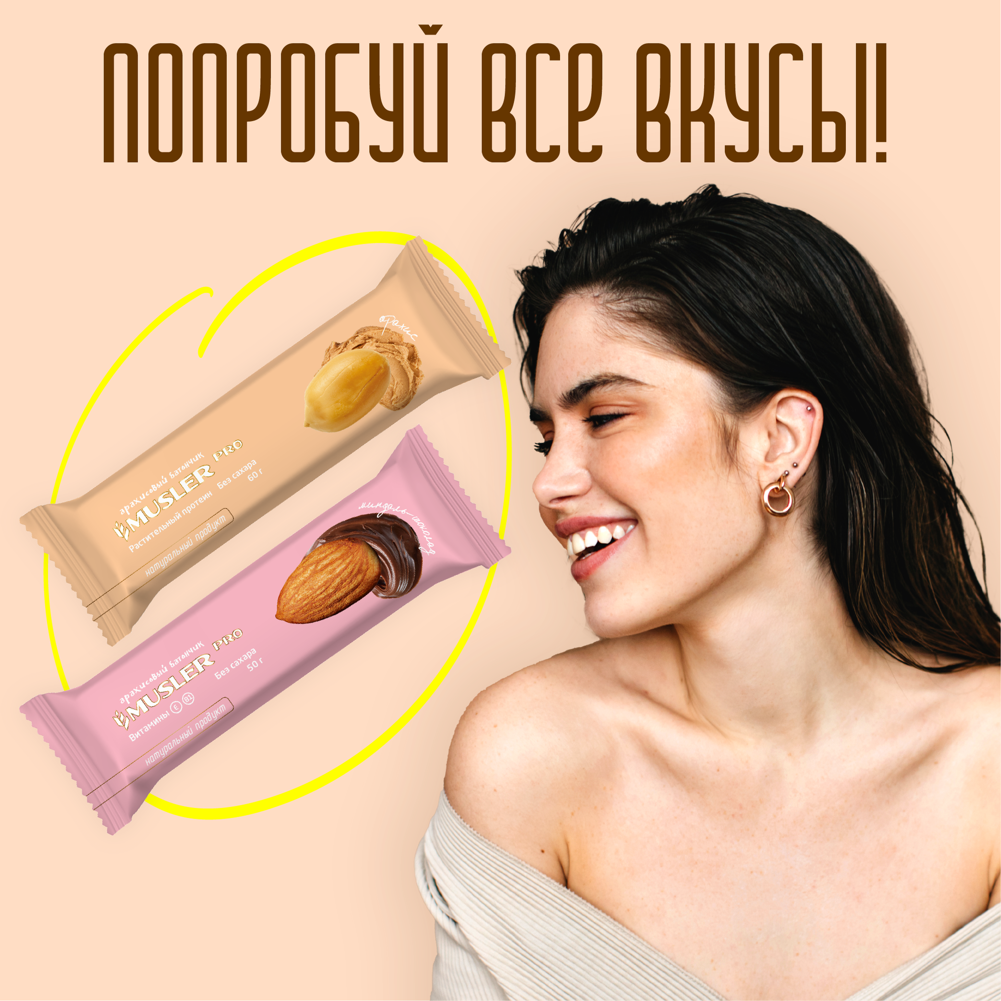 Батончик арахисовый "Миндаль-шоколад" Musler PRO,50г, (10шт)