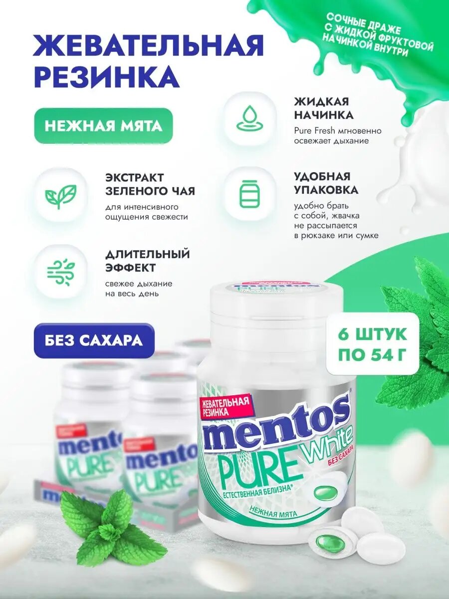 Жевательная резинка Mentos Pure White Нежная мята, 6 шт по 54 г