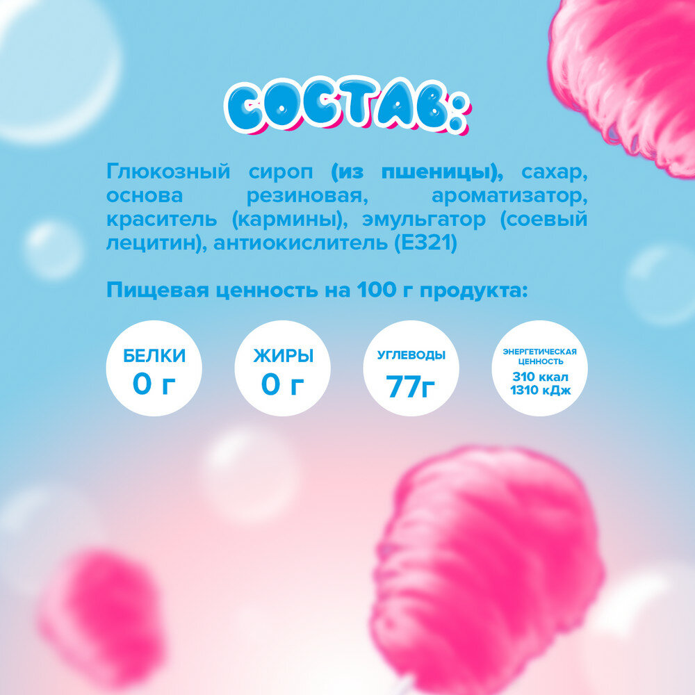 | Состав | глюкозный сироп (из пшеницы), сахар, основа резиновая, ароматизатор, краситель (кармины), эмульгатор (соевый лецитин), антиокислитель (E321) |