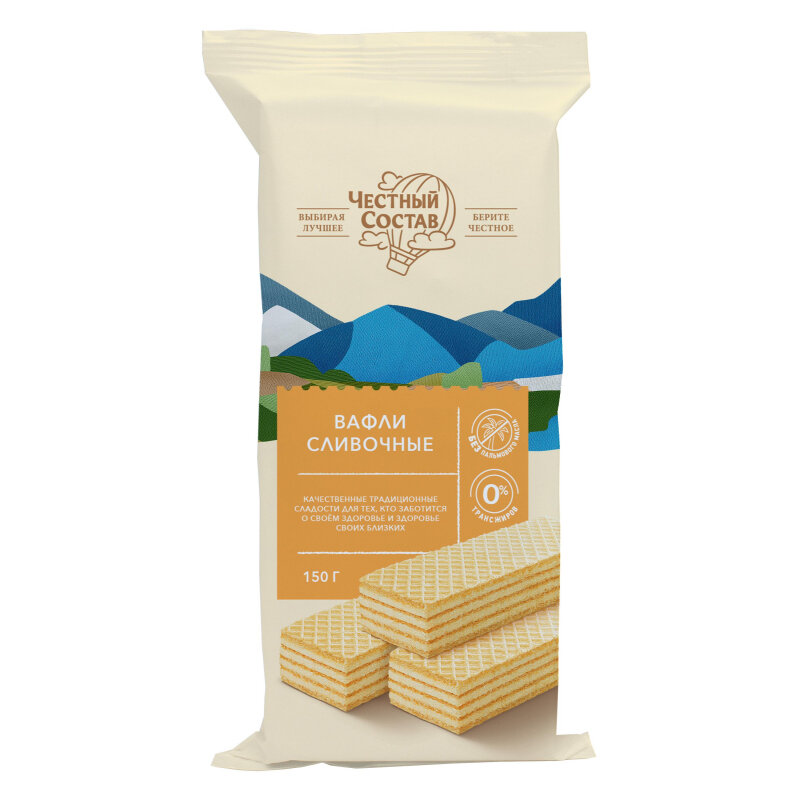 Вафли Сливочные ("Как из Детства"), ТМ "Честный состав", натуральные, без пальмового масла, не содержат ГМО, 150 гр, упаковка, Пермская Фабрика